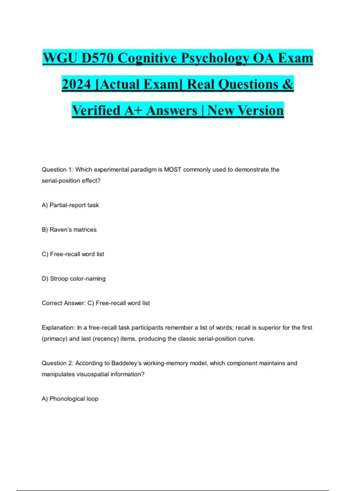 WGU D570 Cognitive Psychology OA Exam 2024 [Actual Exam] Real Questions & Verified A+ Answers | New Version