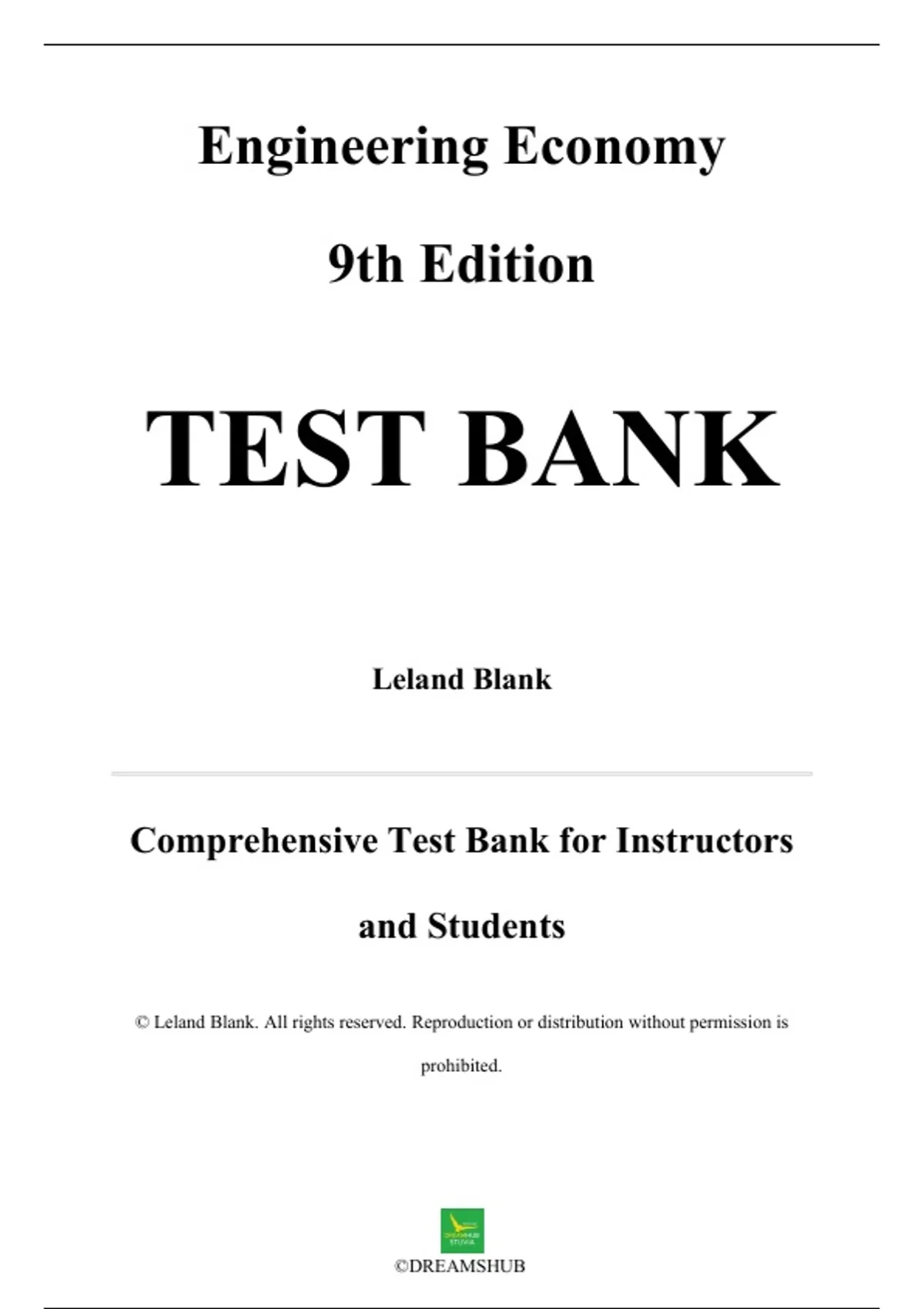 This verified Test Bank entry for Engineering Economy (9th Edition) by Leland T. Blank and Anthony Tarquin (ISBN 9781264158096) provides a comprehensive, chapter‑organized academic resource aligned with the textbook’s structure. Intended for instructors and curriculum developers in engineering and technical finance, it supports coursework in time value of money, project evaluation, cost estimation, risk analysis, and decision‑making under uncertainty. The chapter sequence begins with Chapter 1: Foundations of Engineering Economy, followed by Chapter 2: Factors: How Time and Interest Affect Money, Chapter 3: Combining Factors and Spreadsheet Functions, Chapter 4: Nominal and Effective Interest Rates, then Chapter 5: Analysis Using Present Worth and Future Worth Values, Chapter 6: Annual Worth Analysis, Chapter 7: Rate of Return Analysis: One Project, Chapter 8: Rate of Return Analysis: Multiple Alternatives, Chapter 9: Benefit/Cost Analysis and Public Sector Economics, then Chapter 10: Project Financing and Noneconomic Attributes, Chapter 11: Replacement and Retention Decisions, Chapter 12: Independent Projects with Budget Limitation, Chapter 13: Breakeven and Payback Analysis, followed by Chapter 14: Effects of Inflation, Chapter 15: Cost Estimation and Indirect Cost Allocation, Chapter 16: Depreciation and Depletion Methods, Chapter 17: After‑Tax Economic Analysis, Chapter 18: Sensitivity Analysis and Staged Decisions, and concludes with Chapter 19: Decision Making under Risk.