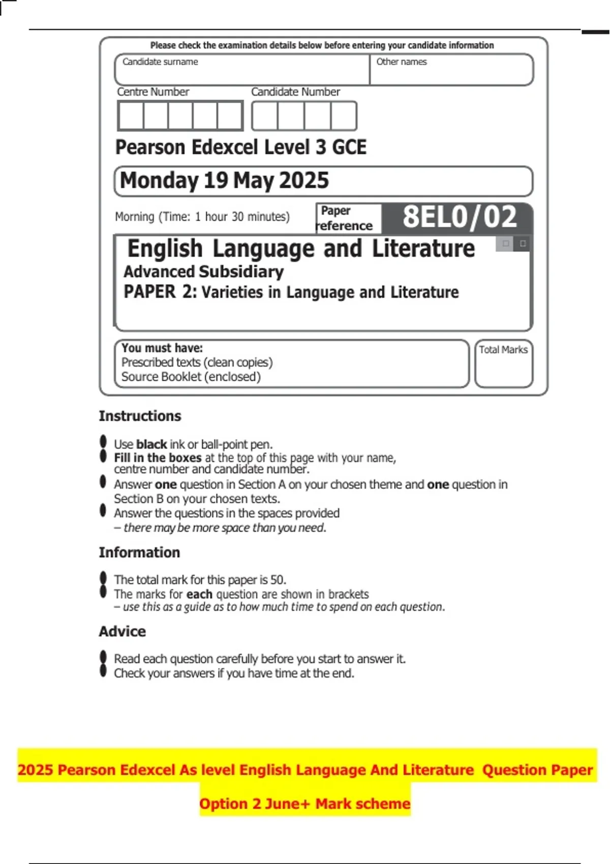 2025 Pearson Edexcel As level English Language And Literature Question Paper