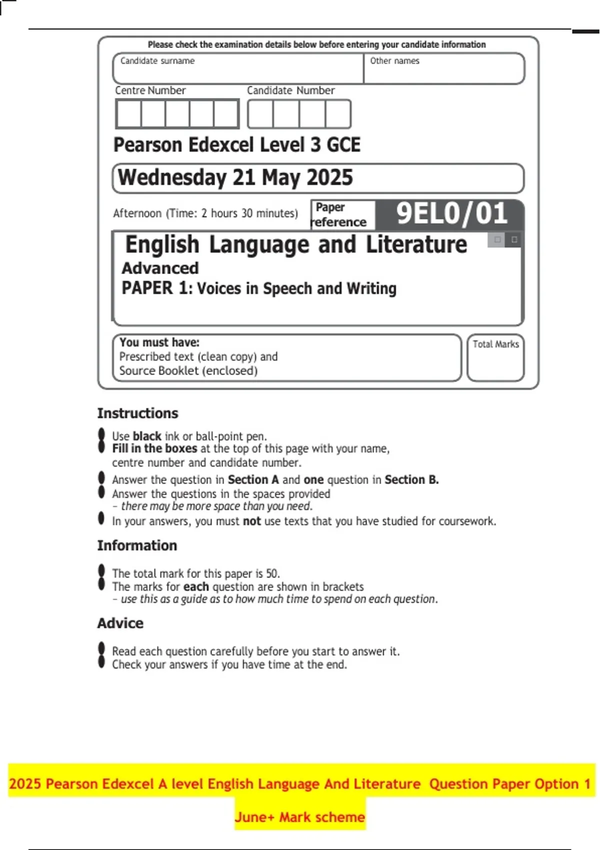 2025 Pearson Edexcel A level English Language And Literature Question Paper Option 1