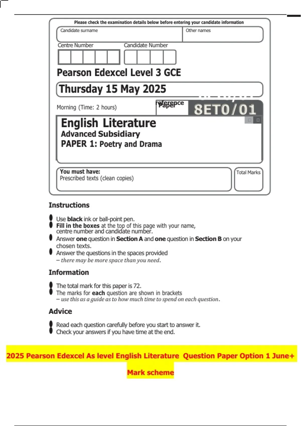 2025 Pearson Edexcel As level English Literature Question Paper Option 1 June+