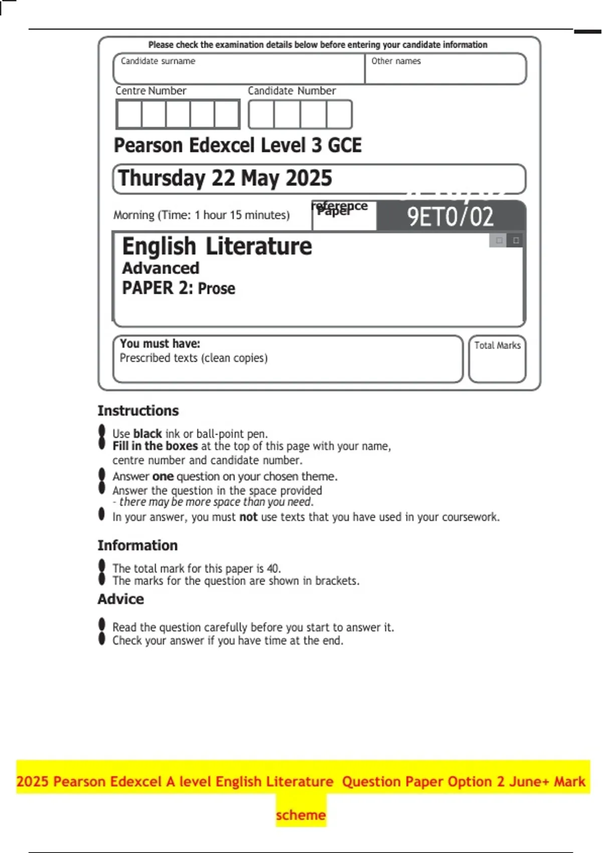 2025 Pearson Edexcel A level English Literature Question Paper Option 2 June+ Mark