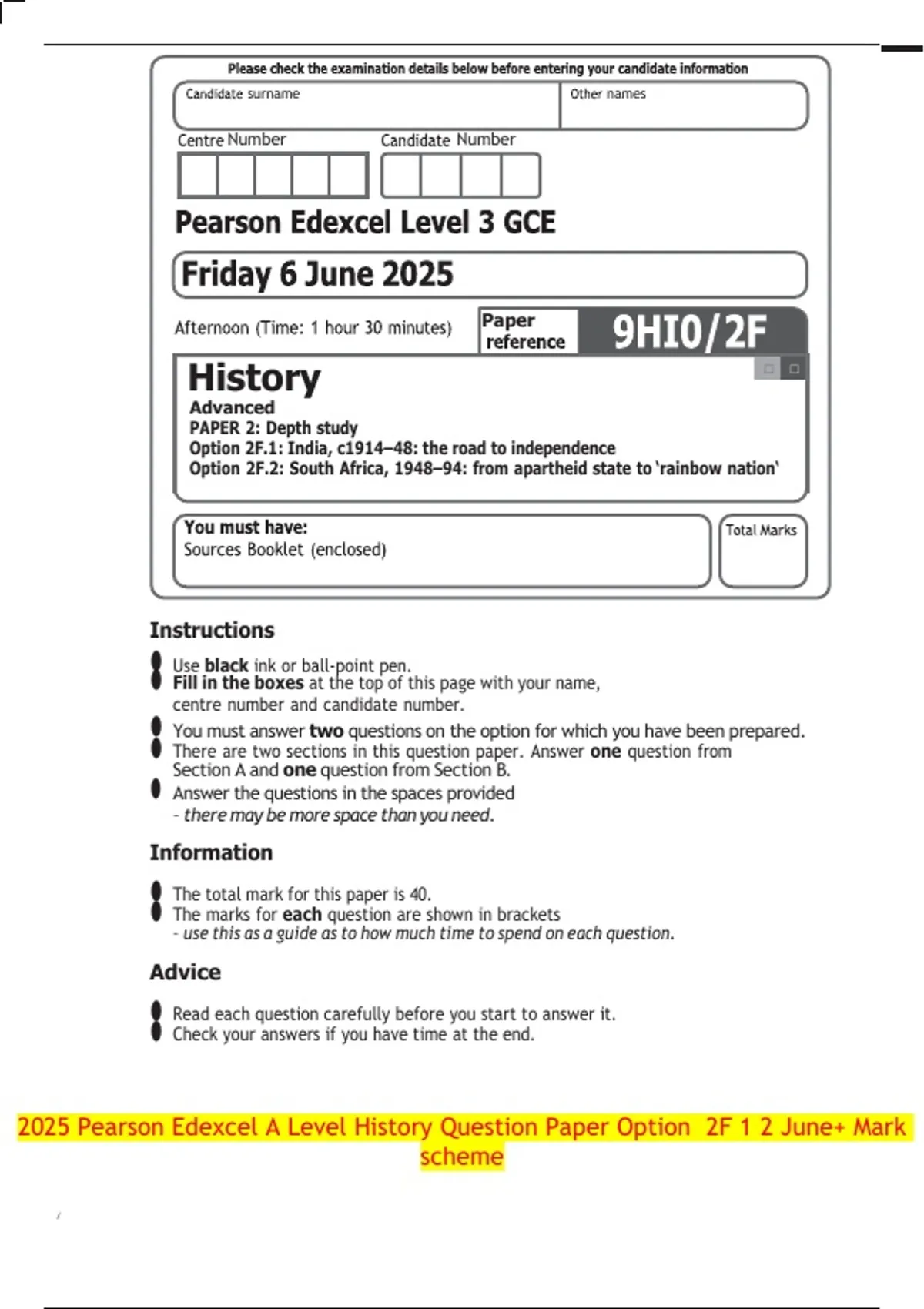 2025 Pearson Edexcel A Level History Question Paper Option 2F 1 2 June+ Mark