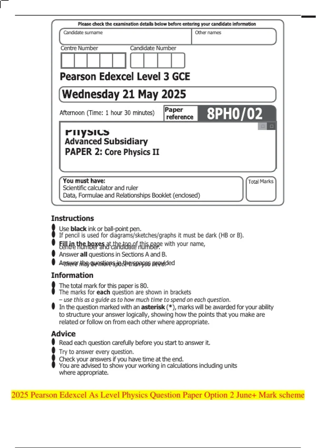 2025 Pearson Edexcel As Level Physics Question Paper Option 2 June+ Mark scheme