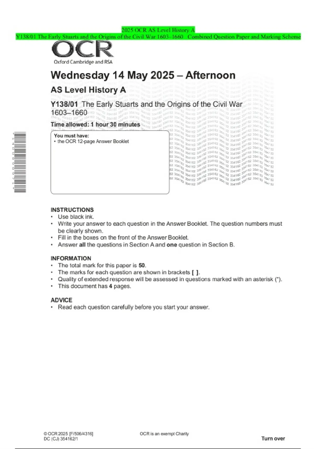 2025 OCR AS Level History A Y138/01 The Early Stuarts and the Origins of the Civil War 1603–1660 Combined Question Paper and Marking Scheme