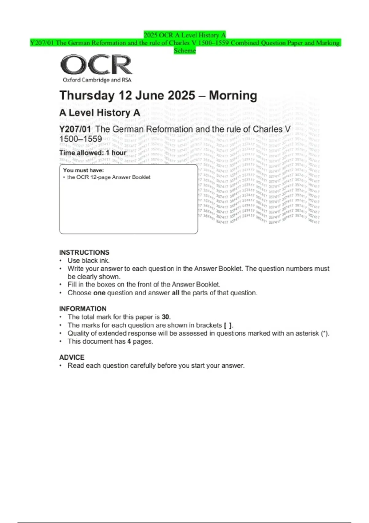 2025 OCR A Level History A Y207/01 The German Reformation and the rule of Charles V 1500–1559 Combined Question Paper and Marking Scheme