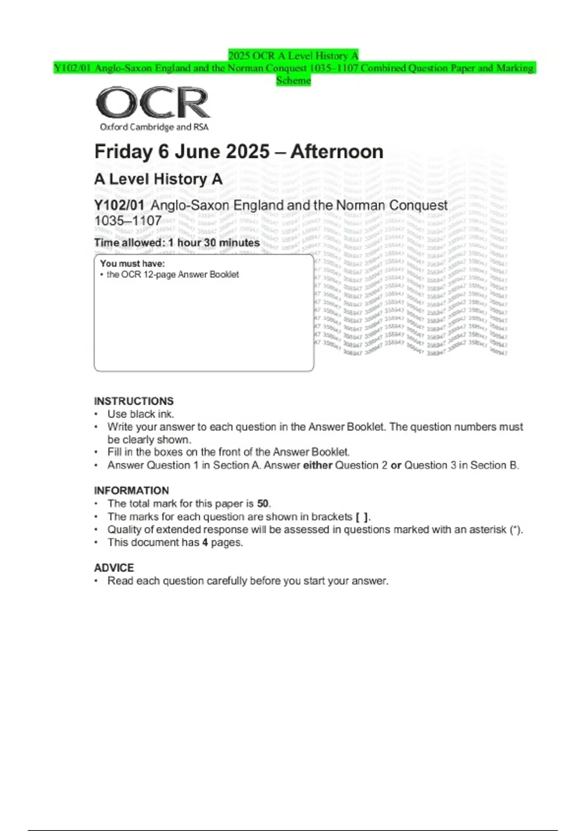 2025 OCR A Level History A Y102/01 Anglo-Saxon England and the Norman Conquest 1035–1107 Combined Question Paper and Marking Scheme