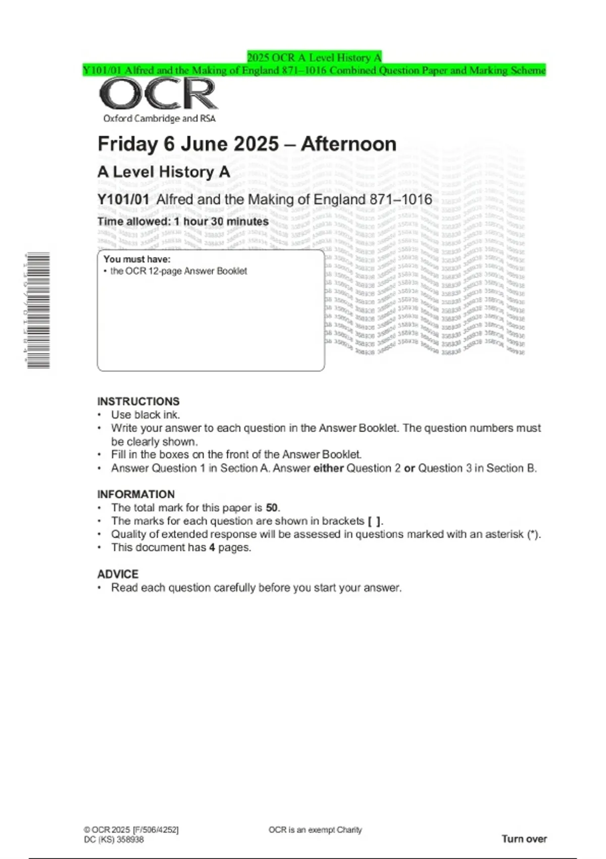 2025 OCR A Level History A Y101/01 Alfred and the Making of England 871–1016 Combined Question Paper and Marking Scheme