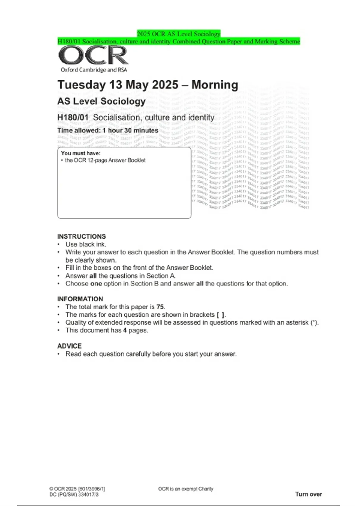 2025 OCR AS Level Sociology H180/01 Socialisation, culture and identity Combined Question Paper and Marking Scheme