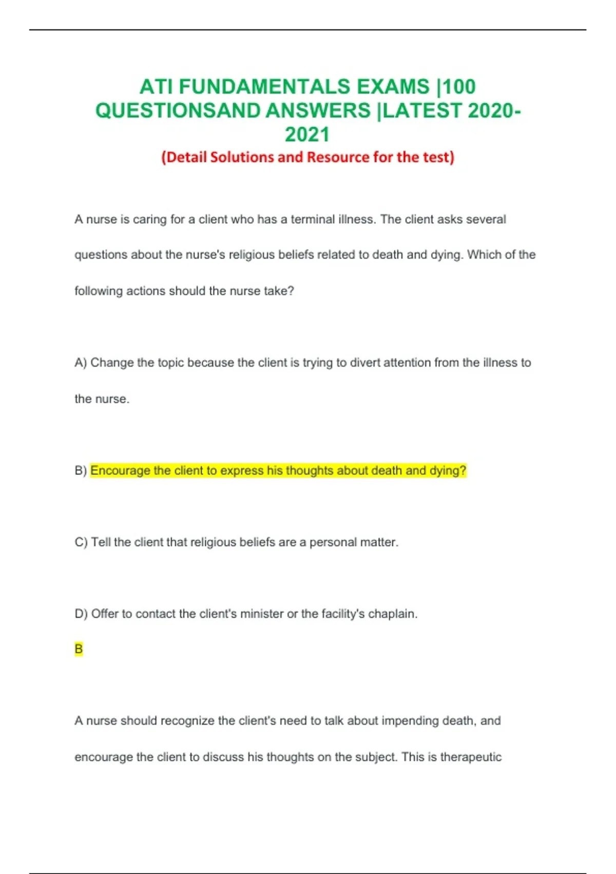 questions about the nurse's religious beliefs related to death and dying. Which of the