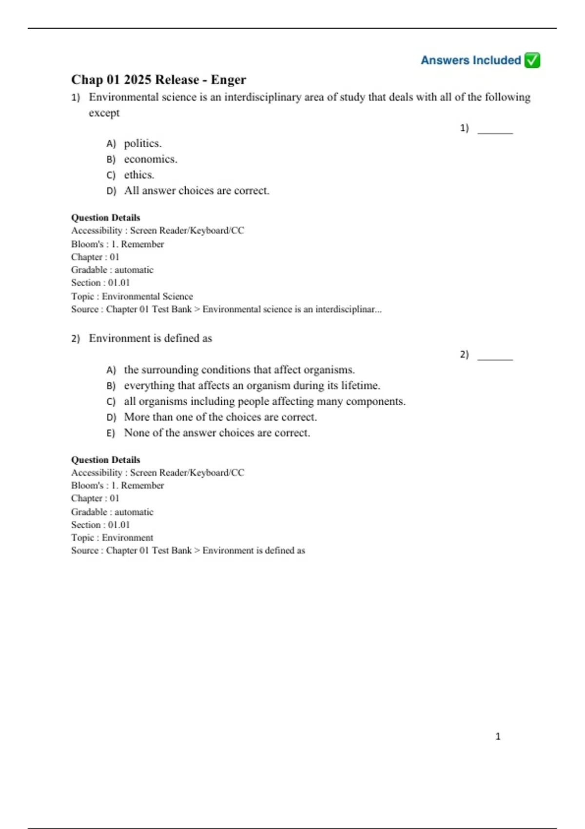 Source : Chapter 01 Test Bank > Environmental science is an interdisciplinar...