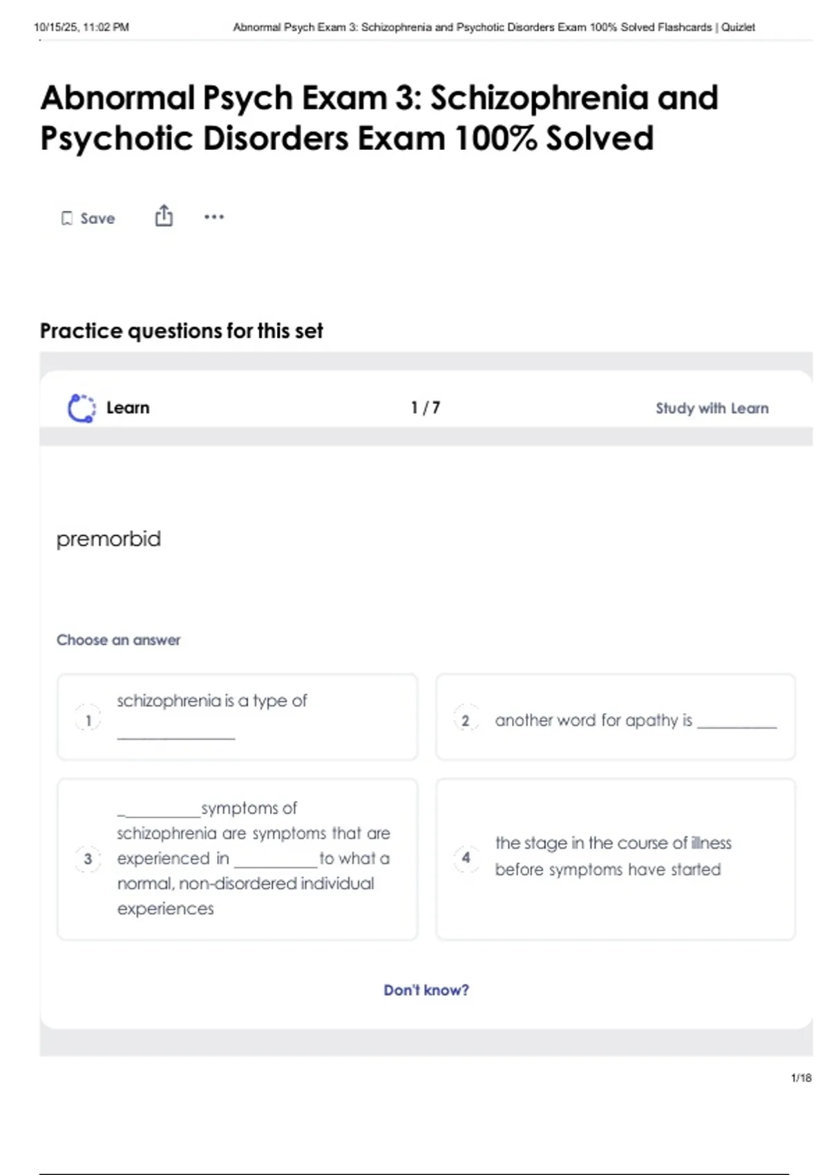 , 10/15/25, 11:02 PM Abnormal Psych Exam 3: Schizophrenia and Psychotic Disorders Exam 100% Solved Flashcards | Quizlet