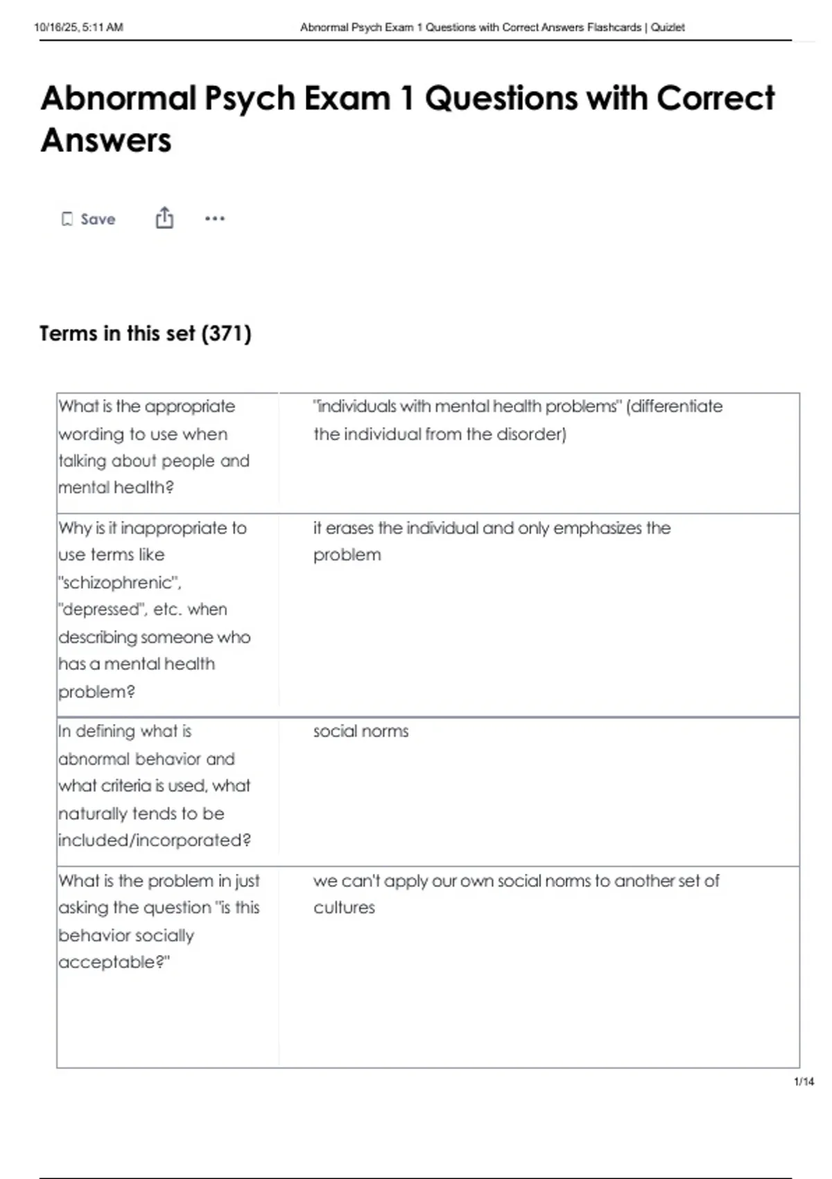, 10/16/25, 5:11 AM Abnormal Psych Exam 1 Questions with Correct Answers Flashcards | Quizlet