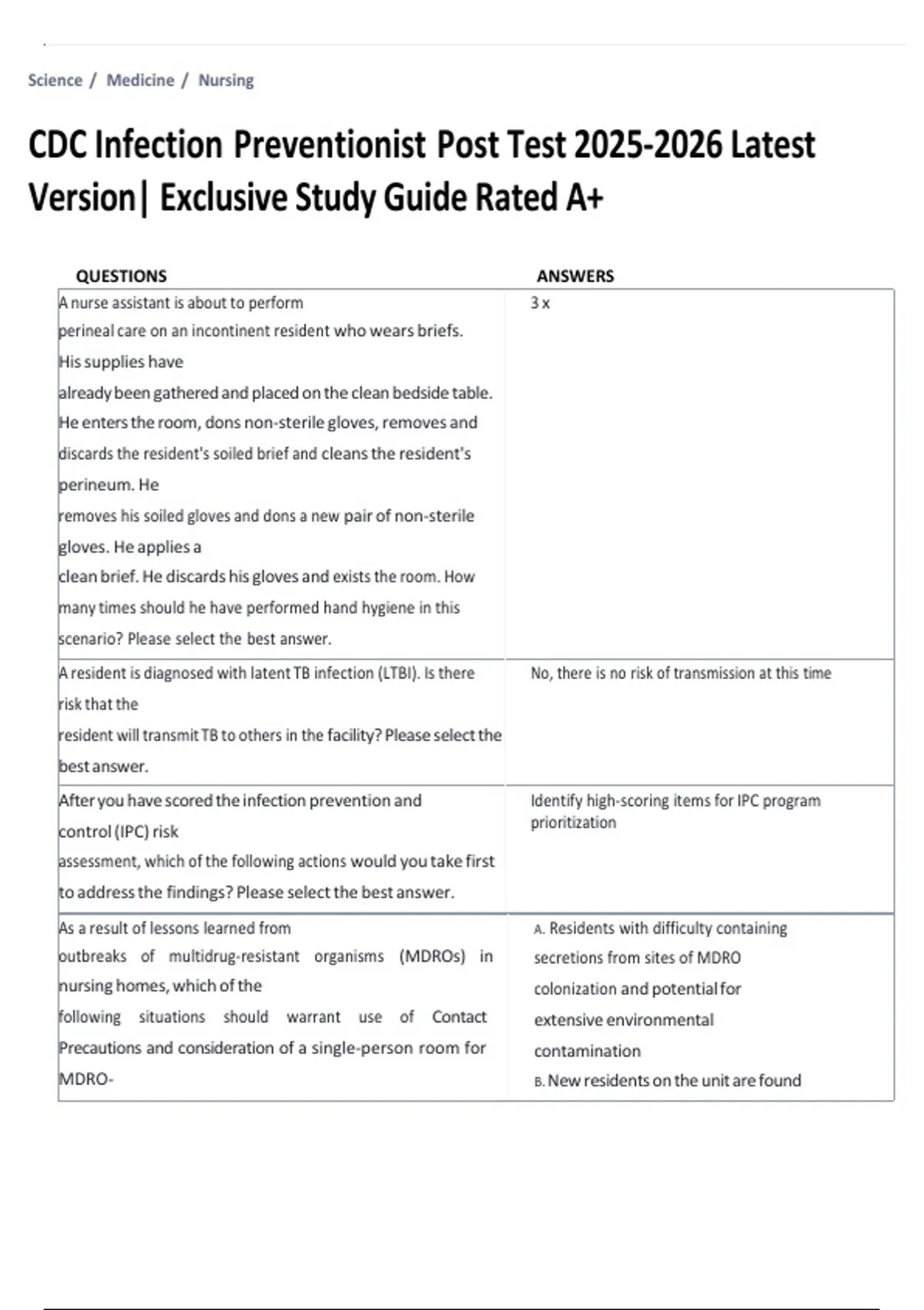 CDC Infection Preventionist Post Test 2025-2026 Latest
