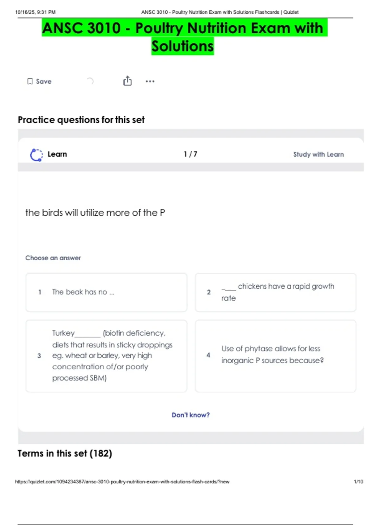 10/16/25, 9:31 PM ANSC 3010 - Poultry Nutrition Exam with Solutions Flashcards | Quizlet