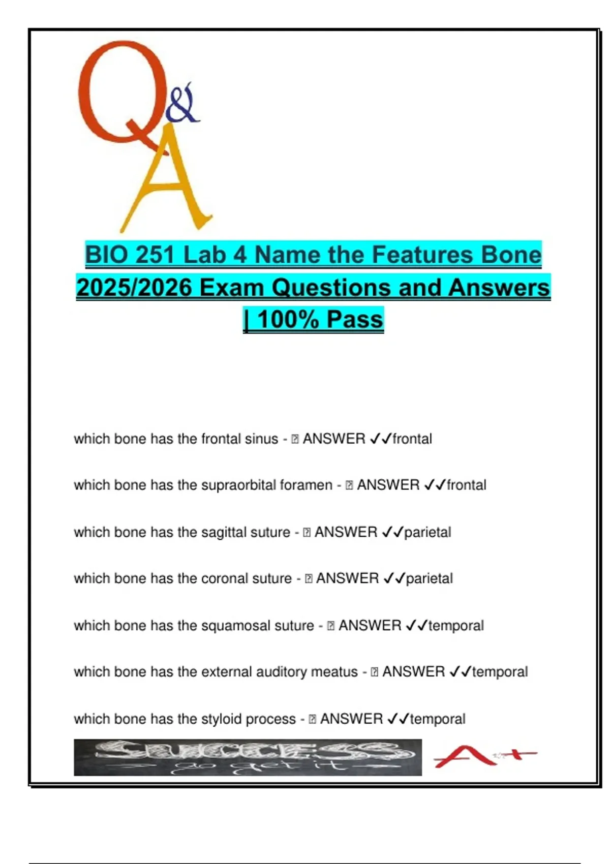 This document is a focused exam prep tool for BIO 251 Lab 4: Anatomy & Physiology, designed for the 2025/2026 academic session. It features structured Q&A covering the anatomical identification of bones and their associated features, based on naming and bone-specific location. The format is ideal for mastering lab practicals and quizzes that test students on skeletal features and their corresponding bones. The material includes rapid-recall questions such as "Which bone has the foramen magnum?", "Which bone has the optic canal?", and many more. It thoroughly covers frontal, parietal, temporal, occipital, sphenoid, ethmoid, mandible, maxilla, and zygomatic bones, and their respective foramina, sutures, processes, and landmarks. This format helps students easily link each anatomical structure to the correct cranial or facial bone. Perfect for students pursuing Biology, Pre-Med, Health Sciences, Nursing, and Kinesiology, this resource supports both rote memorization and contextual understanding required for exams in Human Anatomy & Physiology I or related lab courses. Keywords: cranial bone features, BIO251, skull anatomy quiz, anatomy lab exam, bone identification, foramina, sutures, mandible structures, maxilla, sphenoid bone, optic canal, foramen magnum, human anatomy lab, A&P practical prep