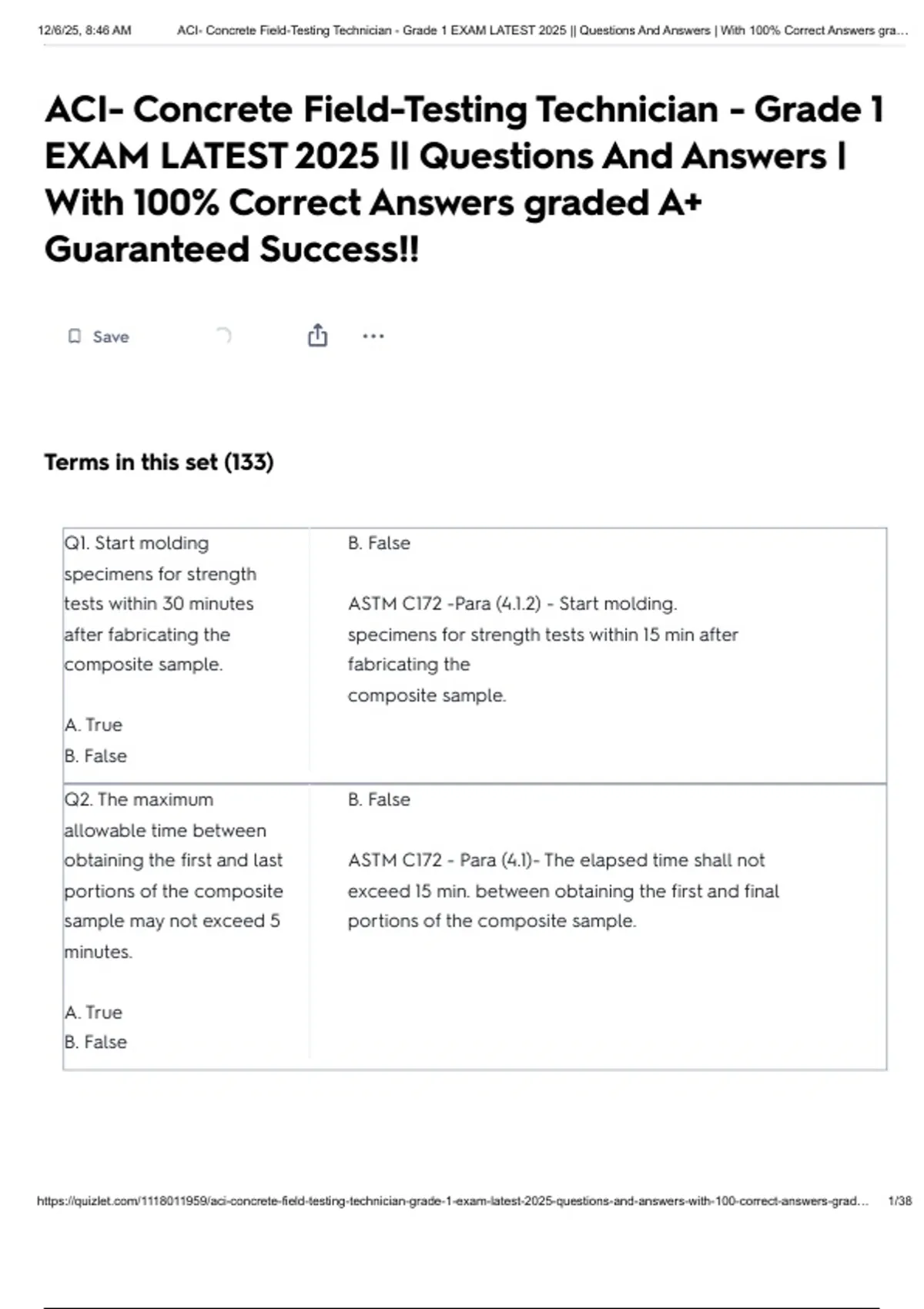 ,12/6/25, 8:46 AM ACI- Concrete Field-Testing Technician - Grade 1 EXAM LATEST 2025 || Questions And Answers | With 100% Correct Answers gra…