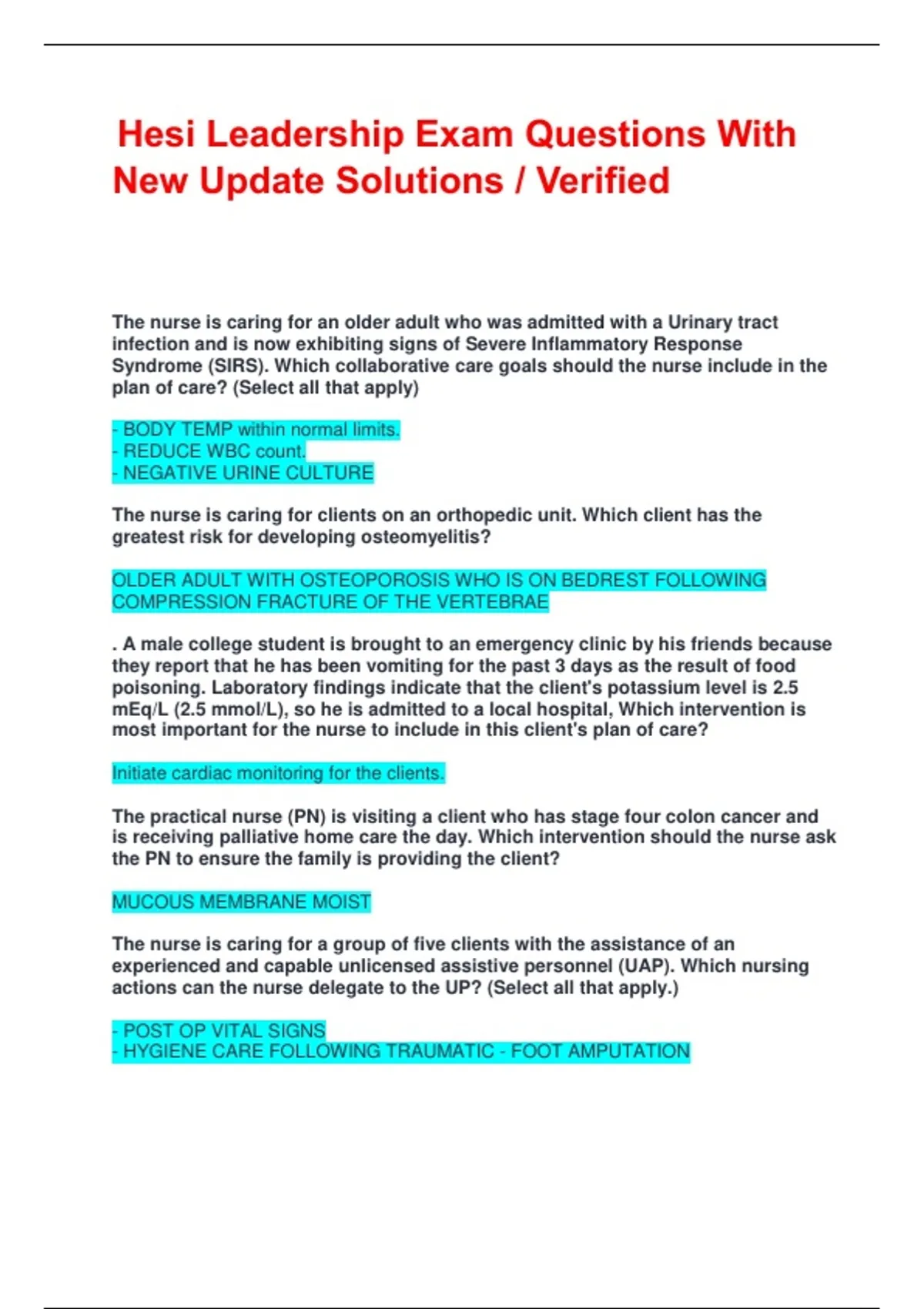 Hesi Leadership Exam Questions With New Update Solutions / Verified
