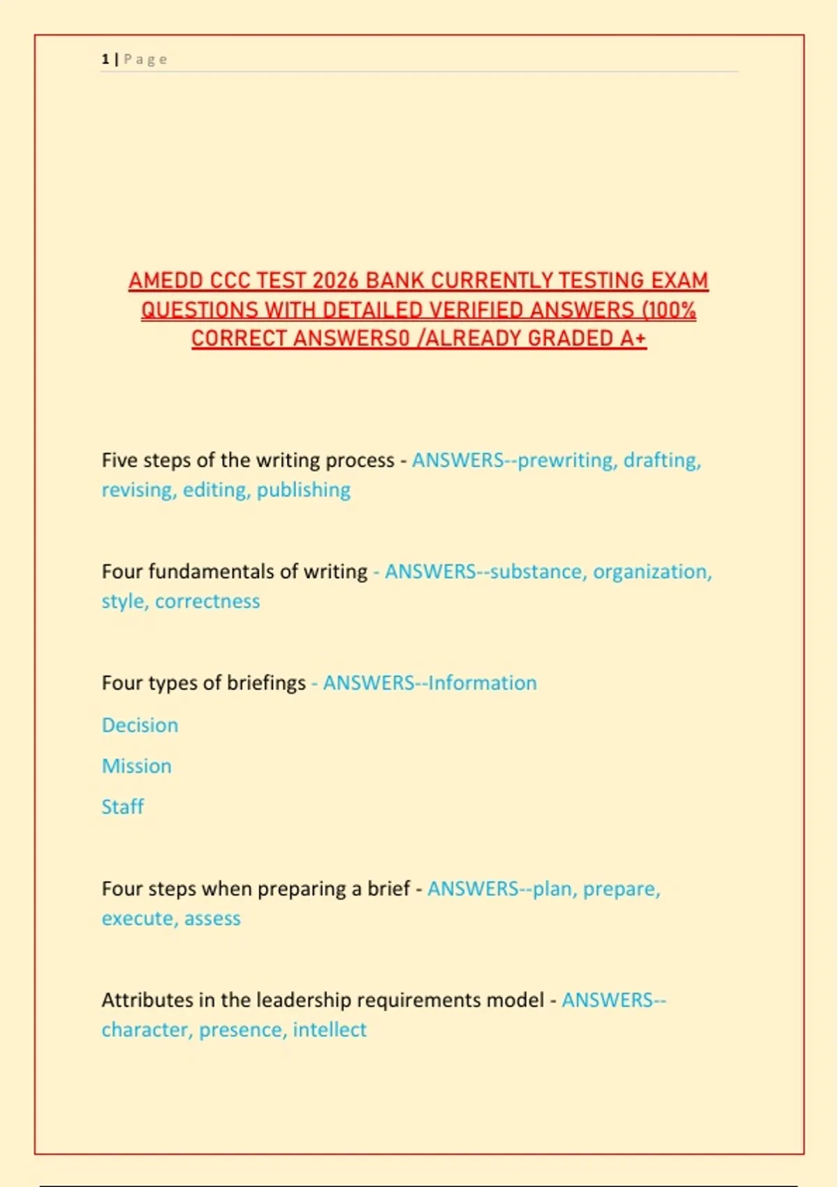 This document serves as a comprehensive study bank for the Army Medical Department (AMEDD) Captain’s Career Course (CCC) Test 2026. It contains a wide range of exam-style questions across multiple domains of military education, each paired with detailed, verified answers. Topics covered include: