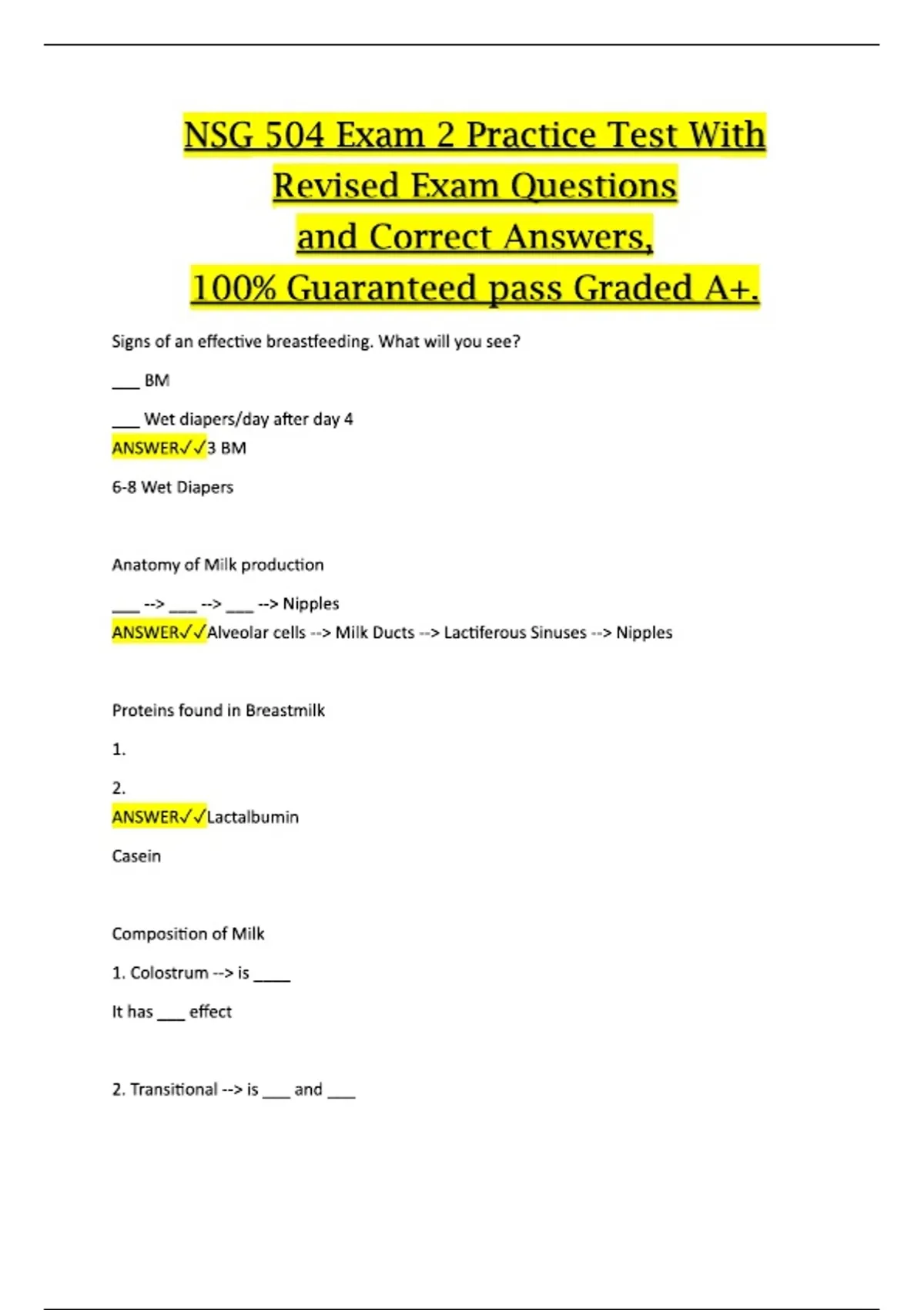 This document contains a revised collection of practice questions for NSG 504 Exam 2, complete with verified correct answers. It covers the essential content areas typically included in the second exam of the course. The material is structured to support thorough review and reinforce understanding of key nursing concepts for effective exam preparation.This document contains a revised collection of practice questions for NSG 504 Exam 2, complete with verified correct answers. It covers the essential content areas typically included in the second exam of the course. The material is structured to support thorough review and reinforce understanding of key nursing concepts for effective exam preparation.This document contains a revised collection of practice questions for NSG 504 Exam 2, complete with verified correct answers. It covers the essential content areas typically included in the second exam of the course. The material is structured to support thorough review and reinforce understanding of key nursing concepts for effective exam preparation.