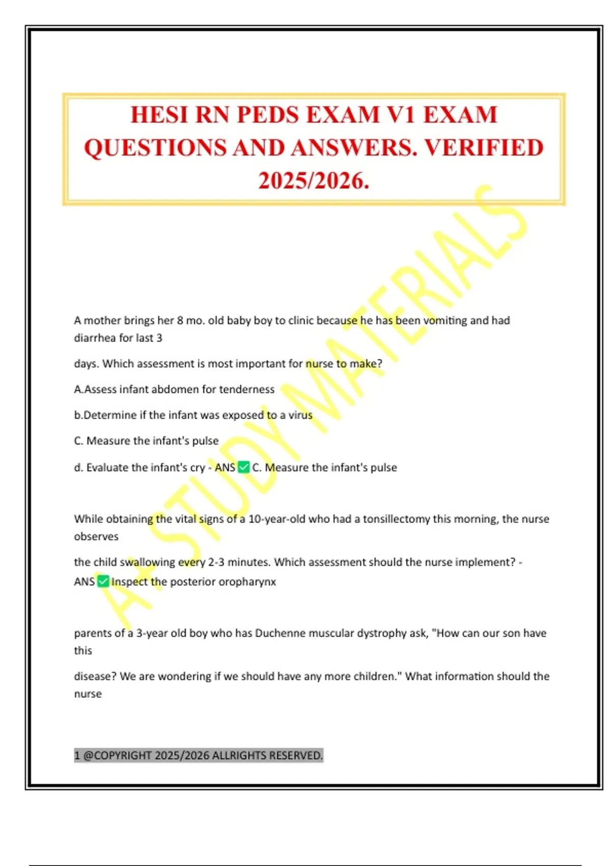 HESI RN PEDS EXAM V1 EXAM QUESTIONS AND ANSWERS. VERIFIED 2025/2026.