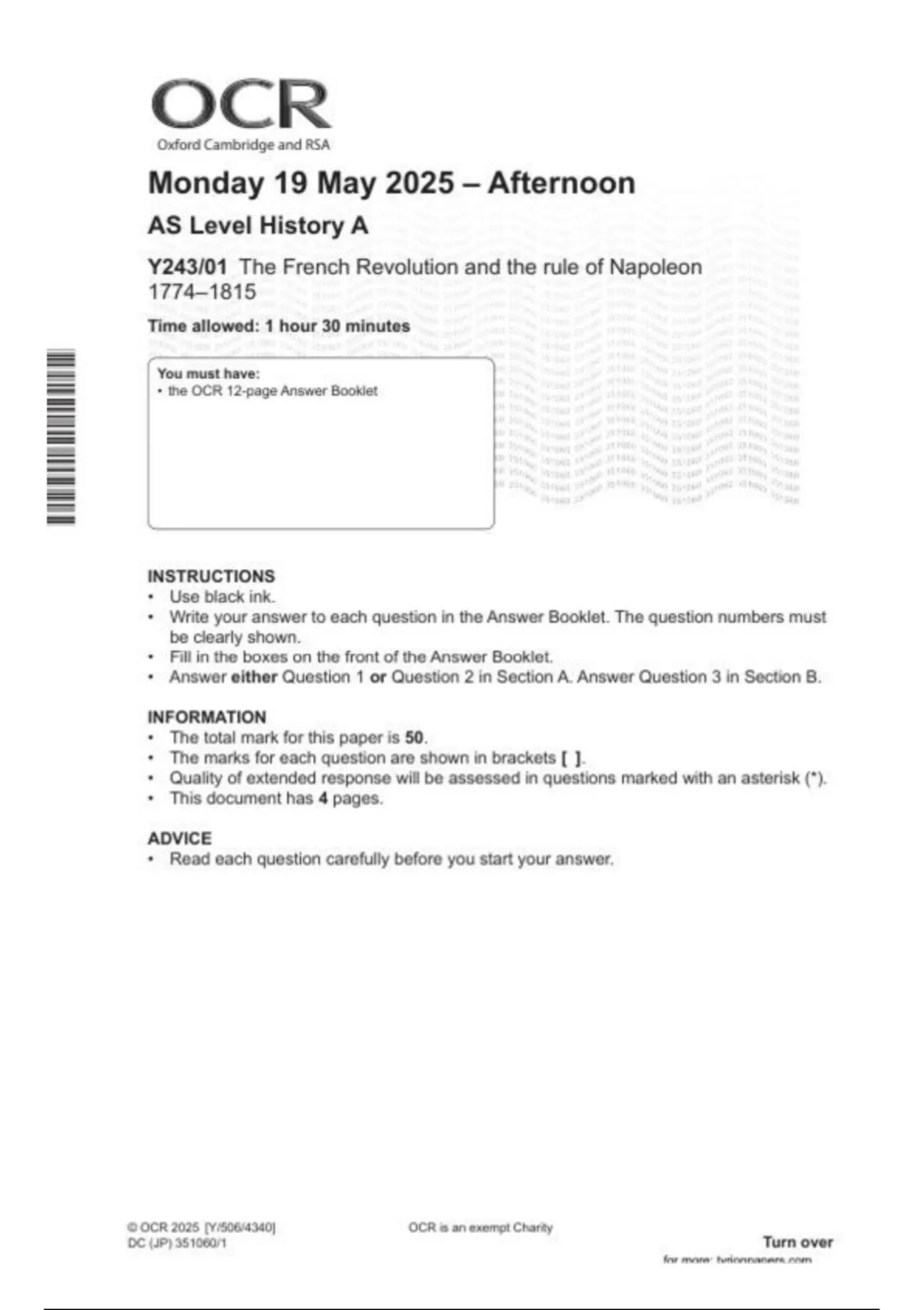 ocr 2025 a level history a paper 1 y243 01 june 2025question paper and mark schememergedocr