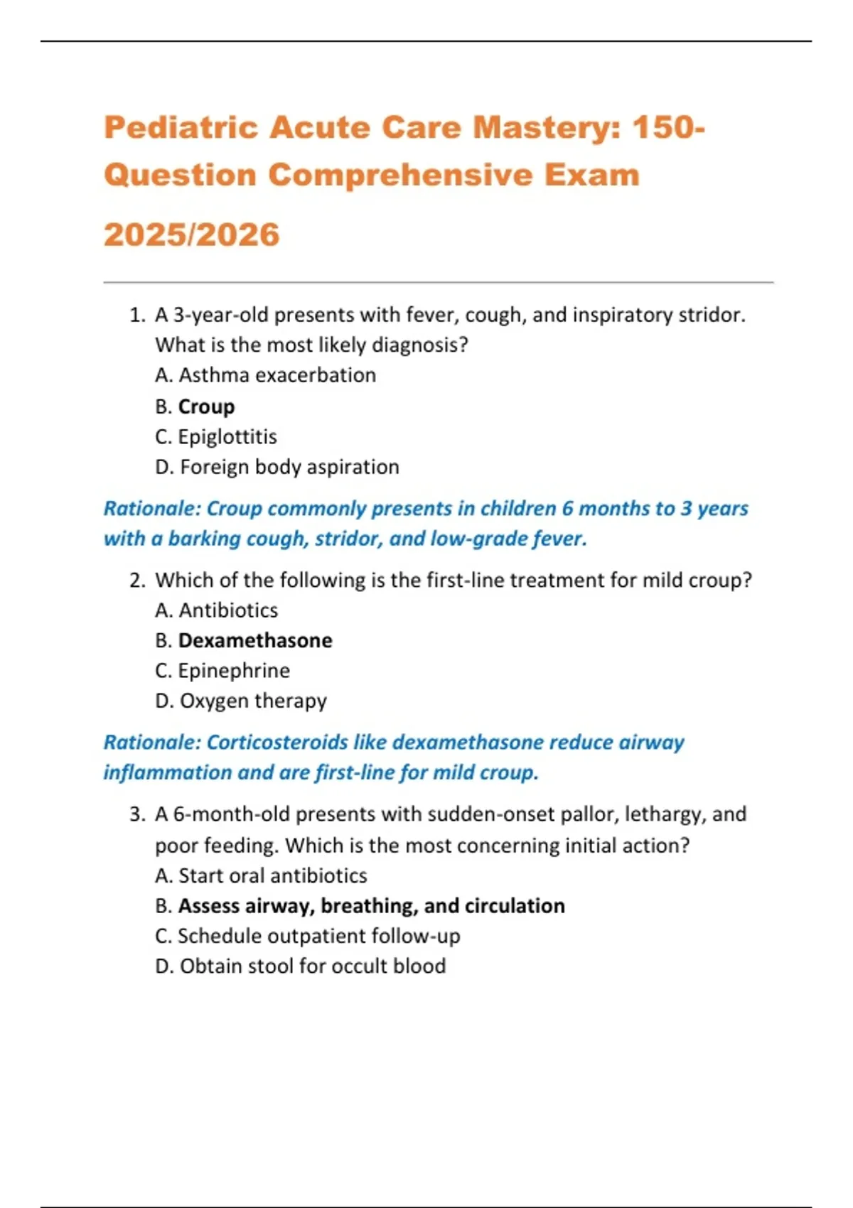 1. A 3-year-old presents with fever, cough, and inspiratory stridor.