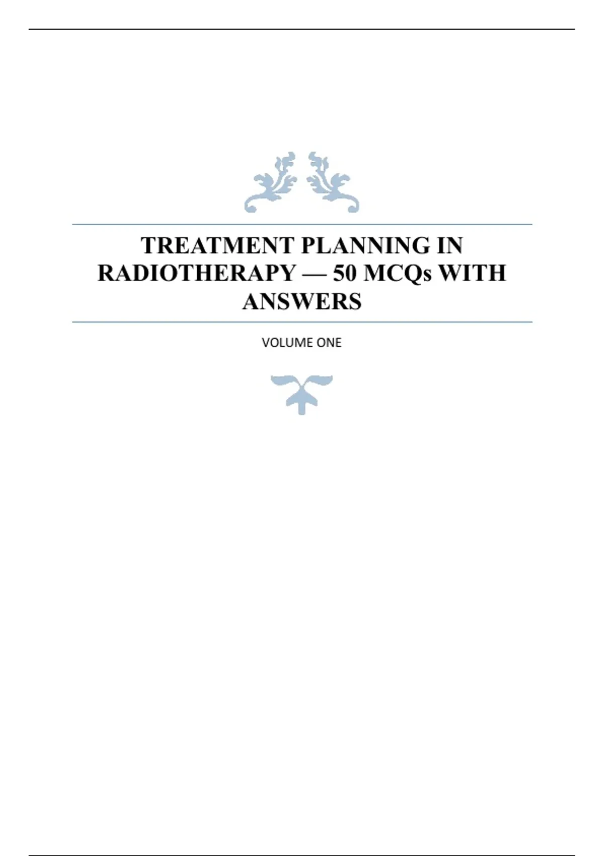 This document contains 50 multiple-choice questions with answers covering essential concepts in radiotherapy treatment planning. Topics include target volumes, imaging, dose prescription, fractionation, treatment techniques, dose calculation algorithms, physics principles, IGRT, and quality assurance. It is a complete practice set designed to support exam preparation and clinical understanding.