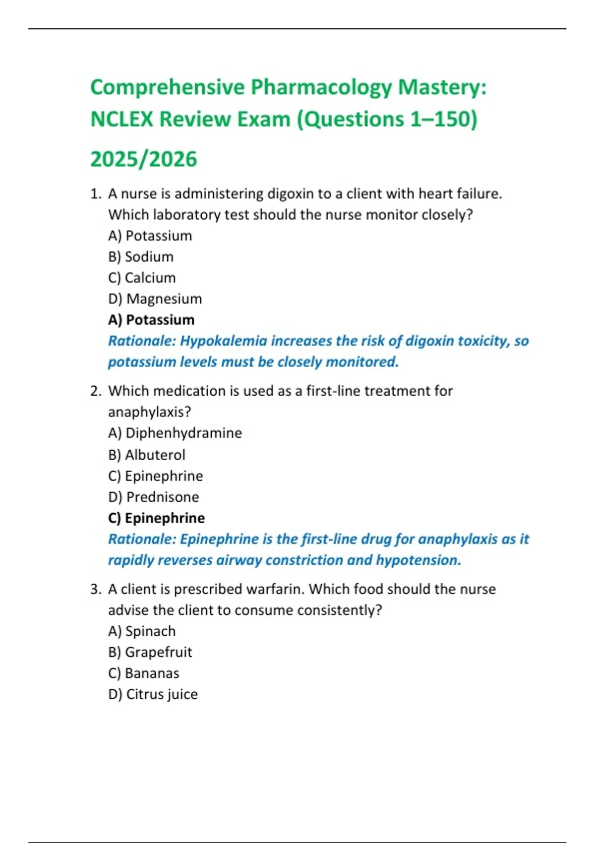 Comprehensive Pharmacology Mastery: NCLEX Review Exam (Questions 1–150) 2025/2026
