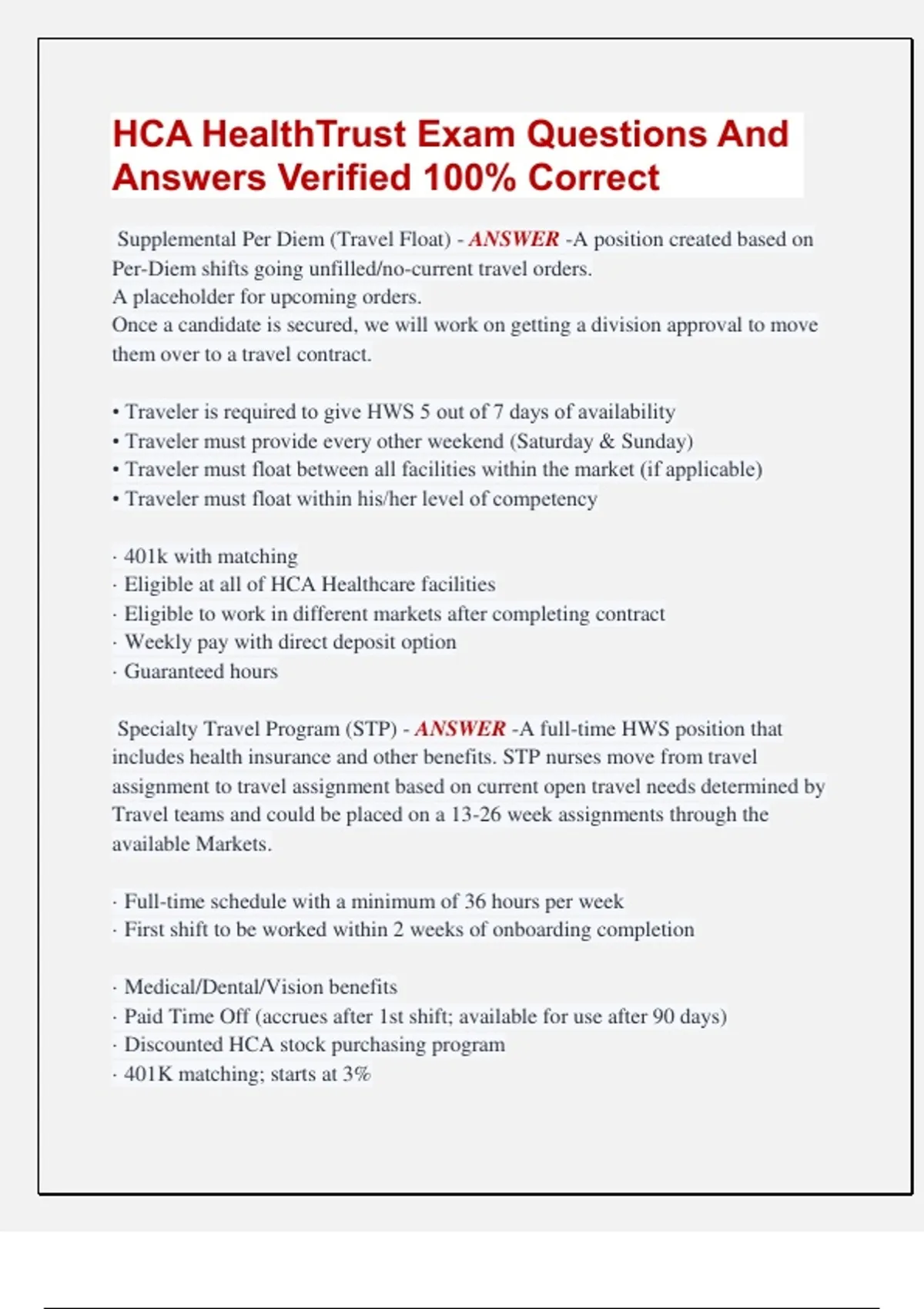 HCA HealthTrust Exam Questions And Answers Verified 100% Correct Supplemental Per Diem (Travel Float) - ANSWER -A position created based on Per-Diem shifts going unfilled/no-current travel orders. A placeholder for upcoming orders. Once a candidate is secured, we will work on getting a division approval to move them over to a travel contract. • Traveler is required to give HWS 5 out of 7 days of availability • Traveler must provide every other weekend (Saturday & Sunday) • Traveler must float between all facilities within the market (if applicable) • Traveler must float within his/her level of competency · 401k with matching · Eligible at all of HCA Healthcare facilities · Eligible to work in different markets after completing contract · Weekly pay with direct deposit option · Guaranteed hours Specialty Travel Program (STP) - ANSWER -A full-time HWS position that includes health insurance and other benefits. STP nurses move from travel assignment to travel assignment based on current open travel needs determined by Travel teams and could be placed on a 13-26 week assignments through the available Markets. · Full-time schedule with a minimum of 36 hours per week · First shift to be worked within 2 weeks of onboarding completion · Medical/Dental/Vision benefits · Paid Time Off (accrues after 1st shift; available for use after 90 days) · Discounted HCA stock purchasing program · 401K matching; starts at 3% · Up to $750 referral bonus for RN referrals (referrals must be entered into HWS portal) Tuition assistance Emergency Response - ANSWER -Candidates from any of the lines of businesses who are actively employed and credentialed who will be deployed to an emergency response situation (strike, natural disaster, etc.) · 1 year of acute care experience in a hospital setting within the last 12 months **If there is a gap in employment within the last year we can accept the candidate if they have at least 2 years of experience. · 1 year of experience in specialty within the last 12 months. · Candidates must have experience in the last calendar year in nursing. The length of the rapid response or crisis situation deployment depends on the criticality of the event. · Lucrative pay package · Housing and transportation provided via HWS · Up to $750 referral bonus for RN referrals (referrals must be entered into HWS portal) StaRN Instructors - ANSWER -Full time or Per Diem position where candidates deliver training for newly graduated nurses transitioning to their new role as a registered nurse. This position also delivers training to non-licensed caregivers in various roles including PCT, PCT Lead and MHT. Instructors assist with skills instruction and simulation training and occasional classroom projects. · 3 years of bedside experience without gaps in a hospital setting · 3 years of experience specialty · Specialty training included and not limited to Medical Surgical Nursing, Medical Surgical Telemetry, ICU, ED, Behavioral Health, Women's Services, Labor and Delivery, Cath Lab, PICU, Pediatrics and OR. Up to $750 referral bonus for RN referrals (referrals must be entered into HWS portal) Dialysis - ANSWER -Dialysis Registered Nurses, also referred to as nephrology nurses, specialize in the care of patients with kidney disease. They help patients who undergo dialysis treatment, a process that removes toxins normally excreted by the renal system. At least 1 year of recent Dialysis experience · Up to $750 referral bonus for RN referrals (referrals must be entered into HWS portal) Vascular Access (PICC) - ANSWER -The Vascular Access clinician is responsible for the anticipation, planning, coordination, and provision of care for the patient while performing and monitoring the clinical insertion of a Peripherally Inserted Central Catheter (PICC), Midline Catheters, Peripheral IV Catheters, and other venous access devices inserted with and without the use of ultrasound guidance. · Evidence of 1 year of adult critical care nursing experience within the past five years or/PICC IV-Therapy experience · Experienced with IV-Therapy/PICC Insertion highly preferred, ACLS, BLS, required and PALS credentials required within 60 days · Ability to learn advanced vascular access procedures for both Adult and Pediatric patients · Ability to travel within Division and Market Up to $750 referral bonus for RN referrals (referrals must be entered into HWS portal) Lawson - ANSWER - Nursys - ANSWER - eStaff - ANSWER -