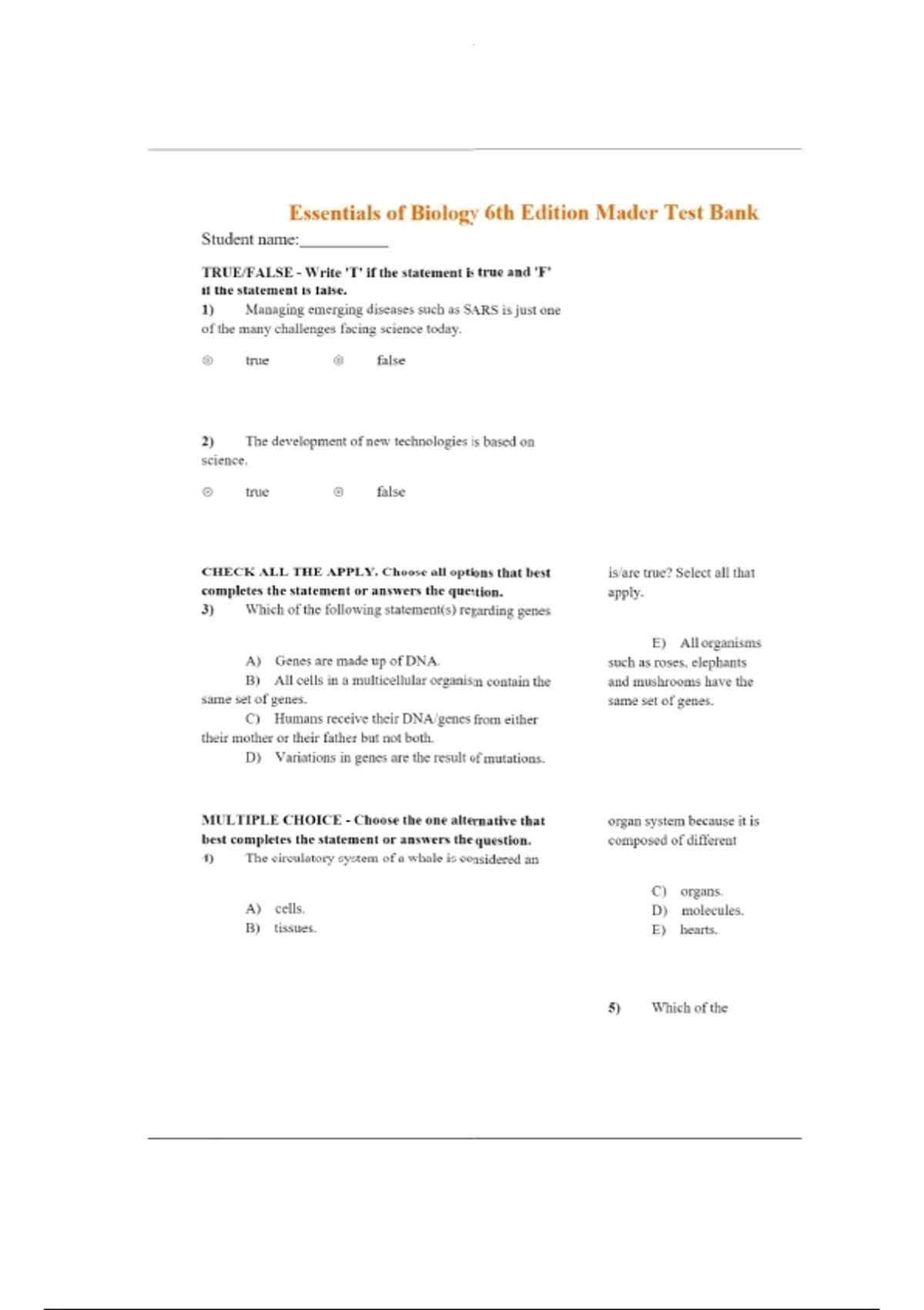 Test Bank For Essentials of Biology 6th Edition Made Review Questions & Answers