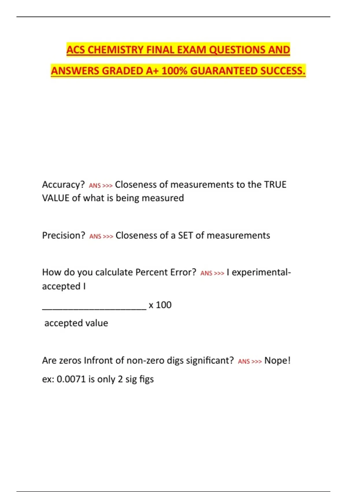 ACS CHEMISTRY FINAL EXAM QUESTIONS AND