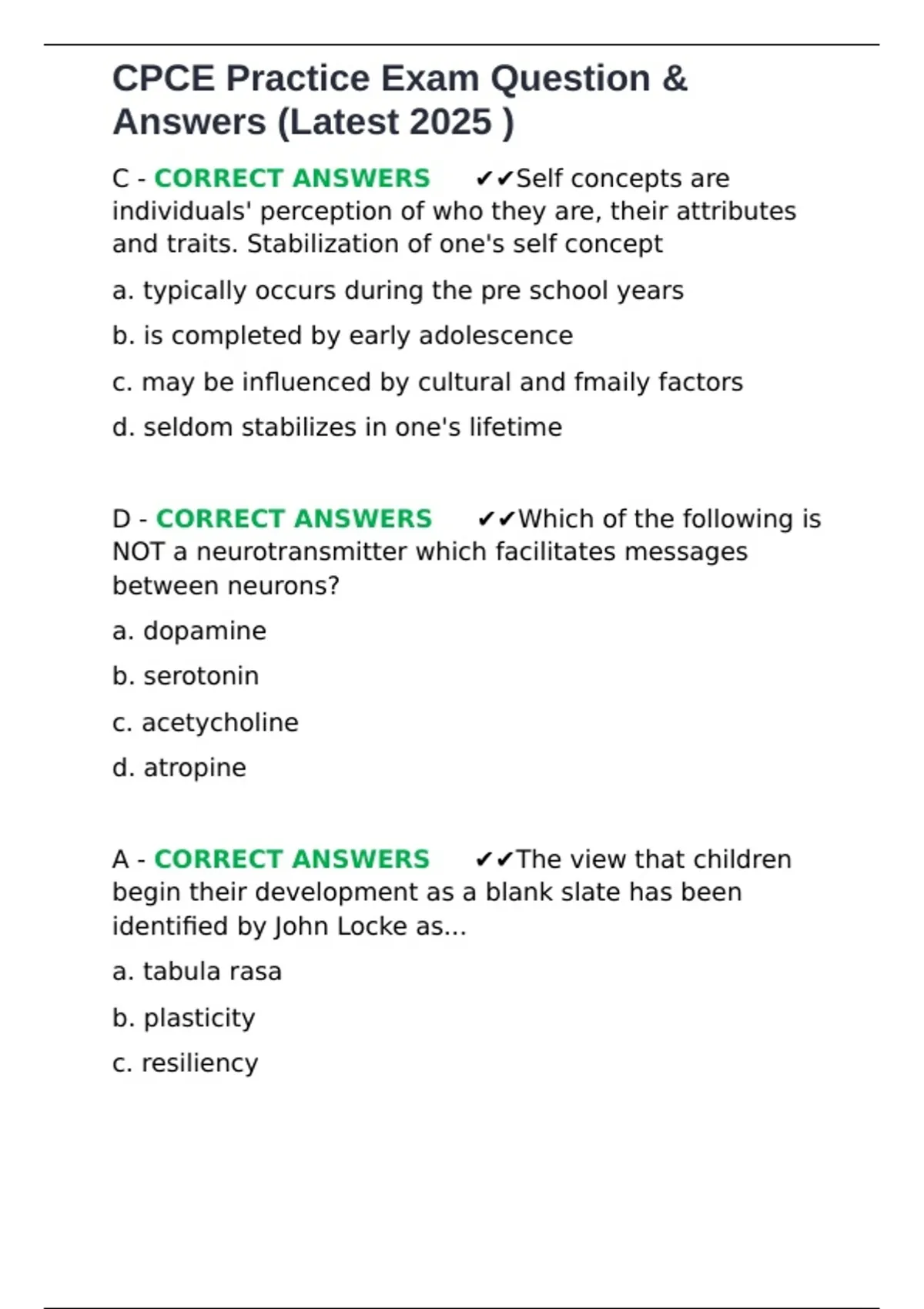 C - CORRECT ANSWERS ✔✔Self concepts are