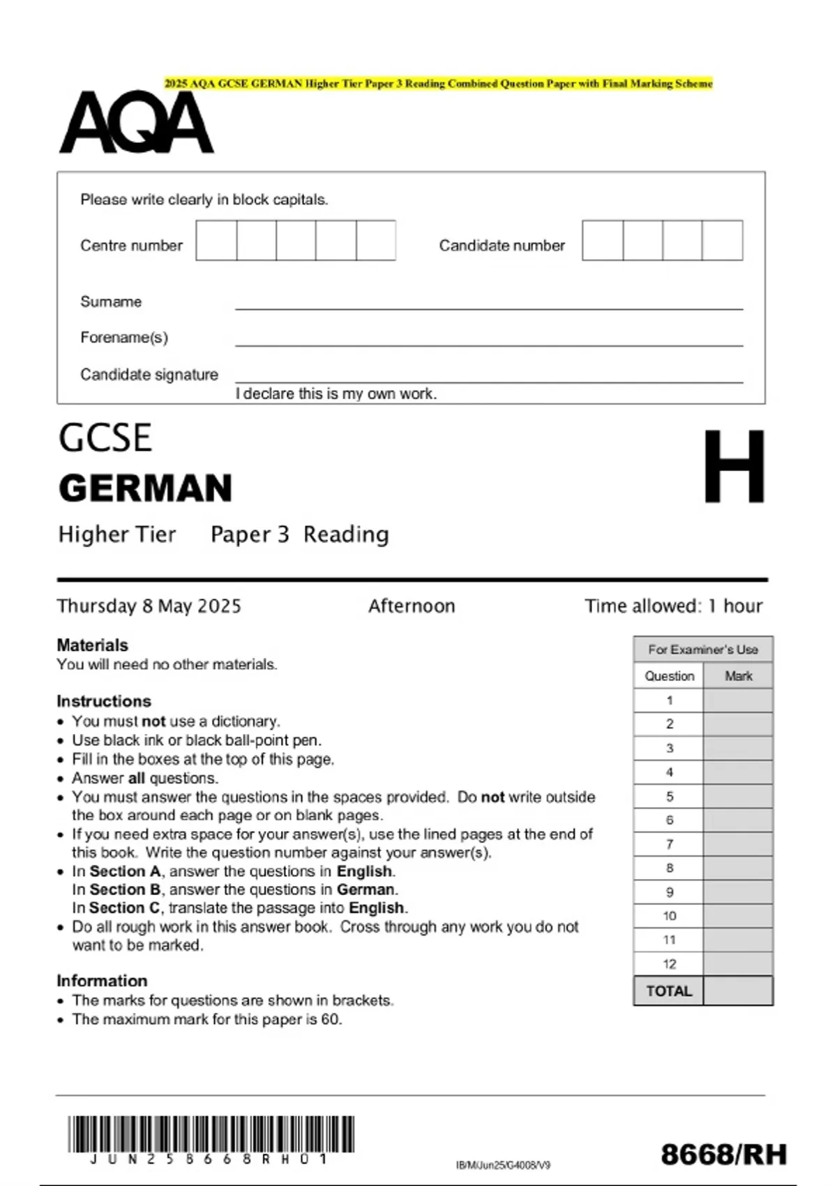2025 AQA GCSE GERMAN Higher Tier Paper 3 Reading Combined Question Paper with Final Marking Scheme