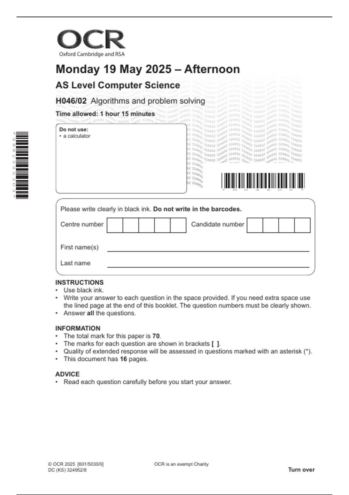 AS-LEVEL OCR COMPUTER SCIENCE PAPER 2 MAY 2025 QUESTION PAPER (H046/02)