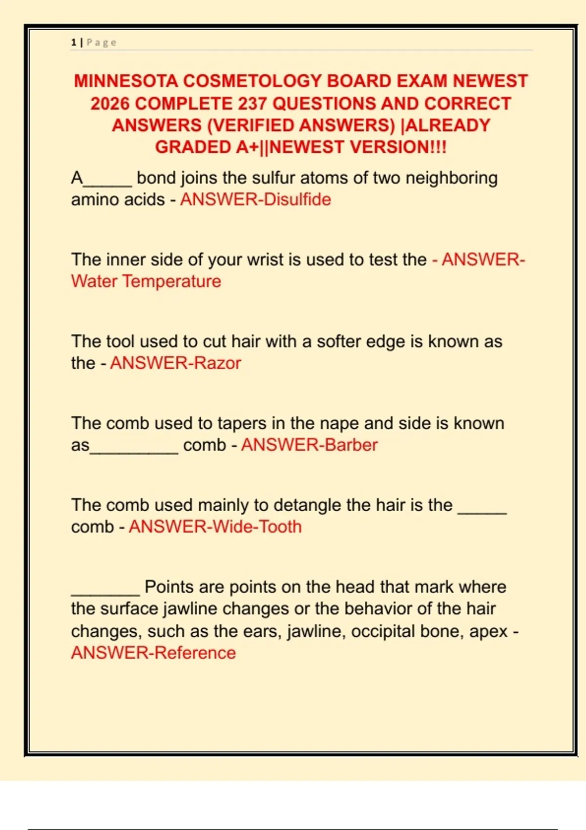 MINNESOTA COSMETOLOGY BOARD EXAM NEWEST 2026 COMPLETE 237 QUESTIONS AND CORRECT ANSWERS (VERIFIED ANSWERS) |ALREADY GRADED A+||NEWEST VERSION!!!