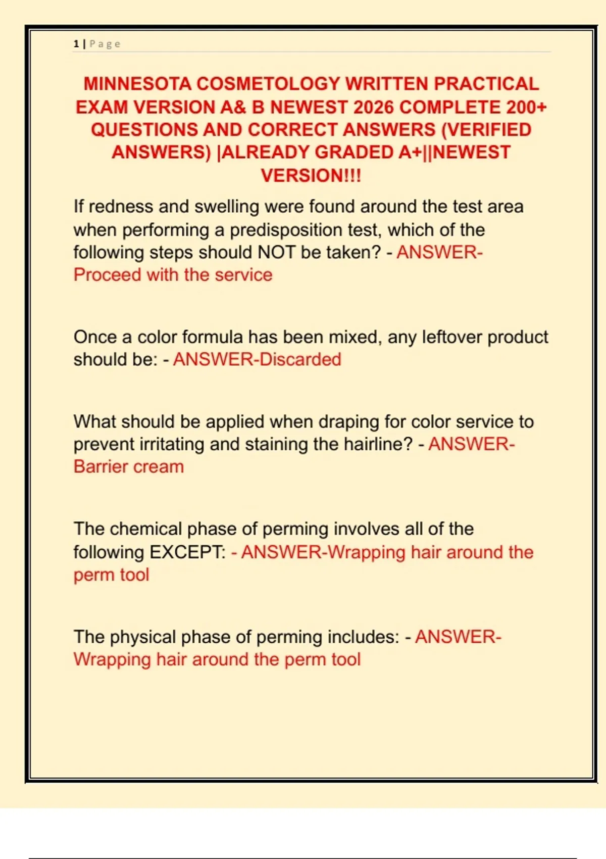 MINNESOTA COSMETOLOGY WRITTEN PRACTICAL EXAM VERSION A& B NEWEST 2026 COMPLETE 200+ QUESTIONS AND CORRECT ANSWERS (VERIFIED ANSWERS) |ALREADY GRADED A+||NEWEST VERSION!!!