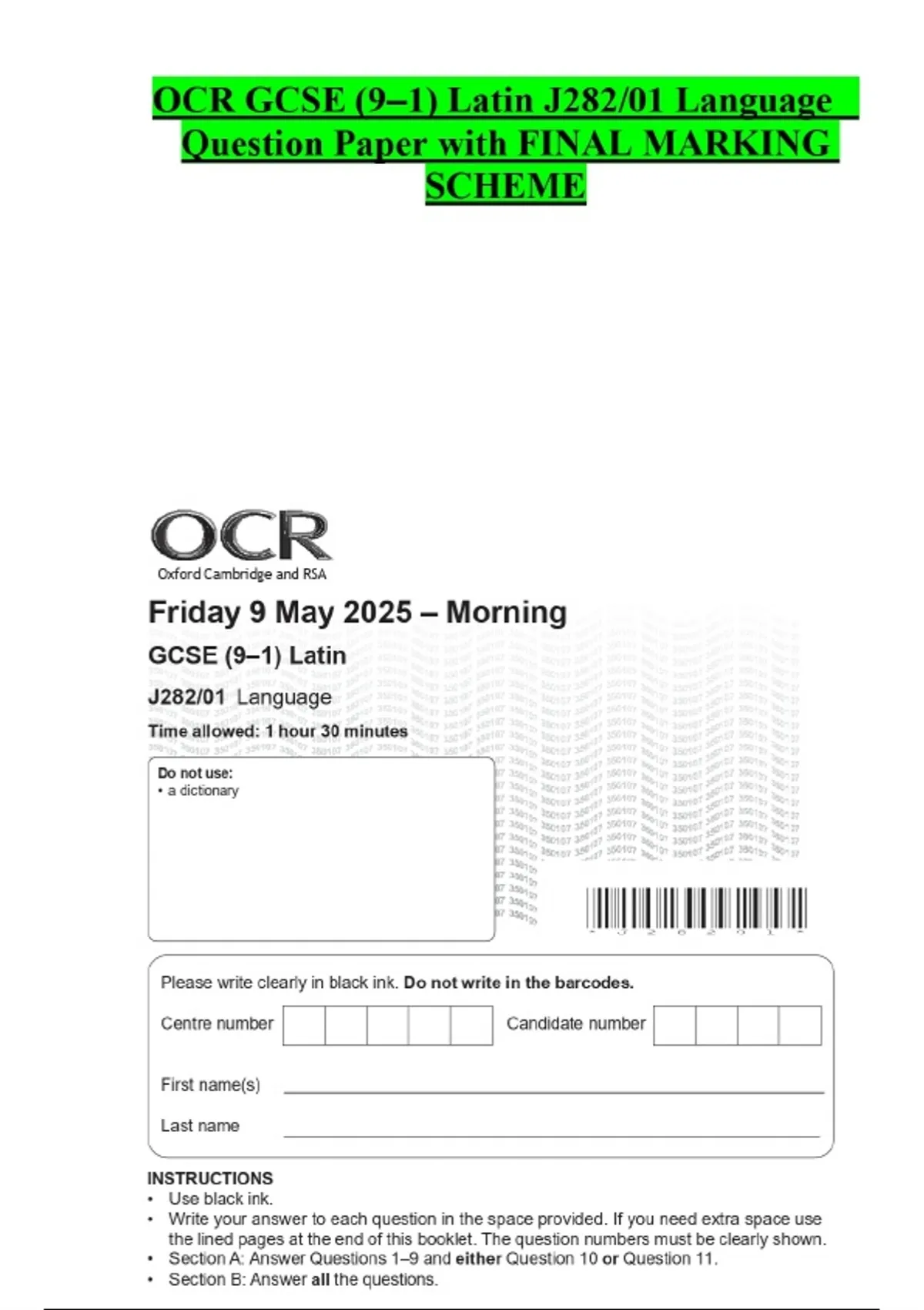 OCR GCSE (9–1) Latin J282/01 Language Question Paper with FINAL MARKING SCHEME