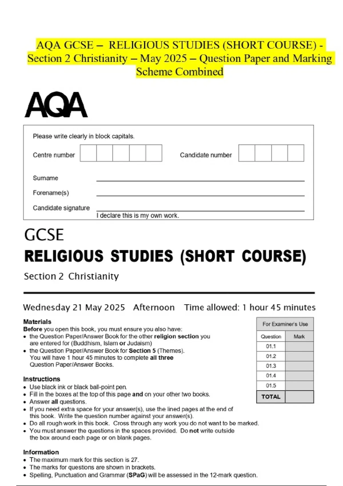 AQA GCSE - RELIGIOUS STUDIES (SHORT COURSE) - Section 2 Christianity - May 2025 - Question Paper and Marking Scheme Combined