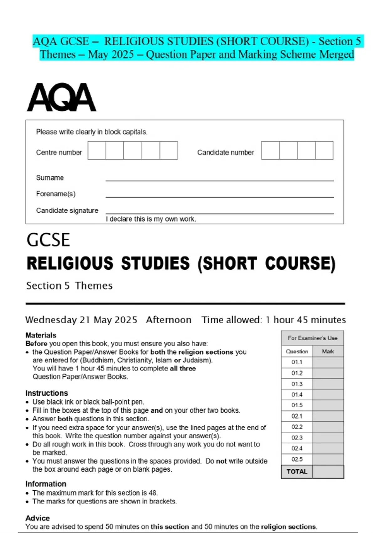 AQA GCSE - RELIGIOUS STUDIES (SHORT COURSE) - Section 5 Themes - May 2025 - Question Paper and Marking Scheme Merged