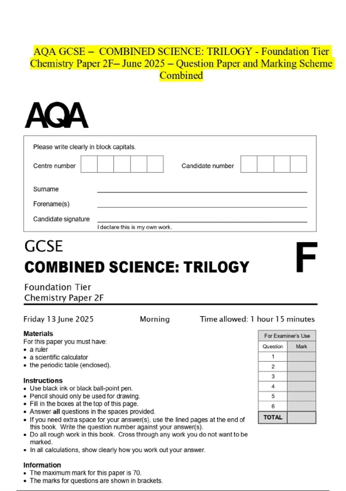 AQA GCSE - COMBINED SCIENCE: TRILOGY - Foundation Tier Chemistry Paper 2F- June 2025 - Question Paper and Marking Scheme Combined