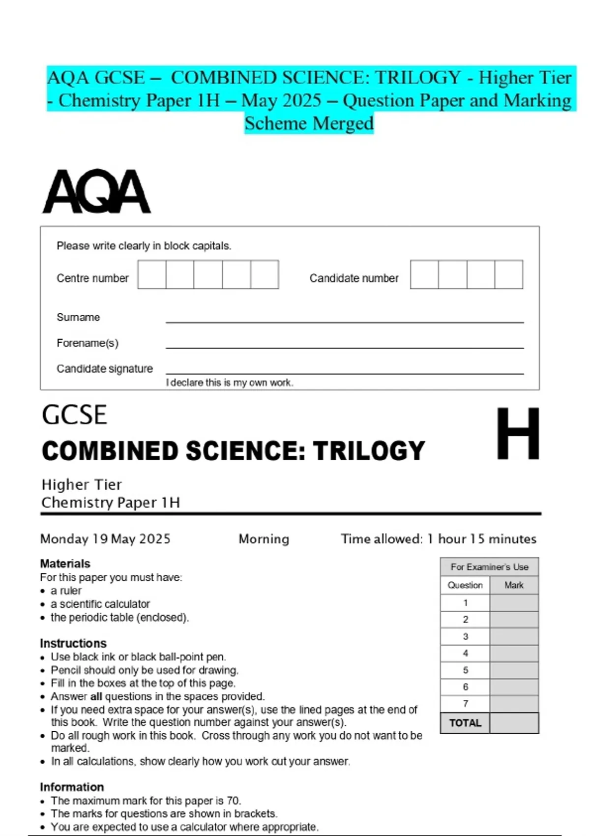 AQA GCSE - COMBINED SCIENCE: TRILOGY - Higher Tier - Chemistry Paper 1H – May 2025 – Question Paper and Marking Scheme Merged