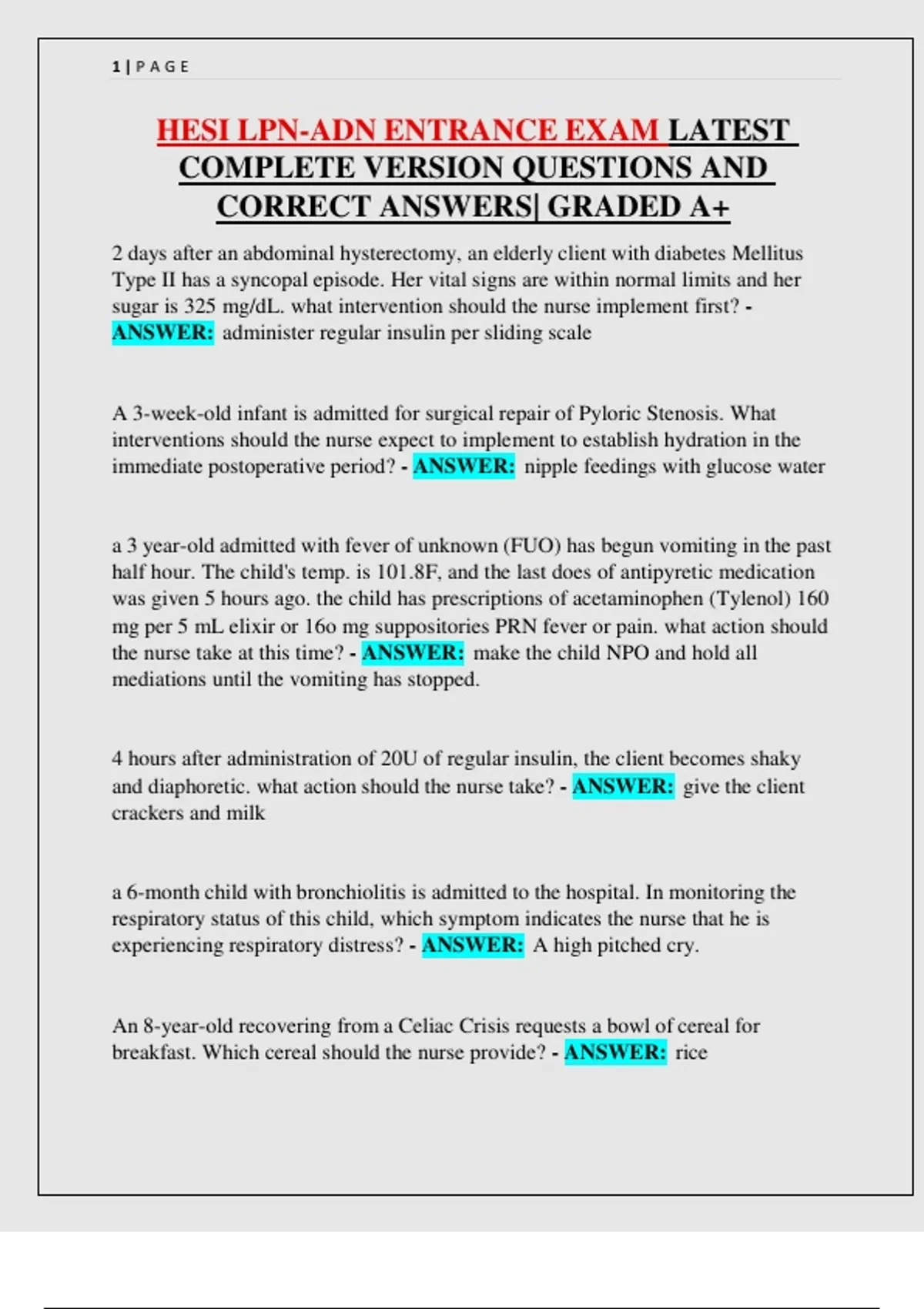 HESI LPN-ADN ENTRANCE EXAM LATEST COMPLETE VERSION QUESTIONS AND CORRECT ANSWERS| GRADED A+