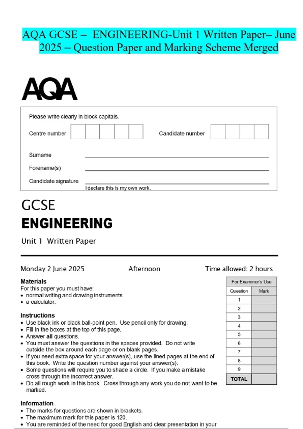 AQA GCSE - ENGINEERING-Unit 1 Written Paper- June 2025 - Question Paper and Marking Scheme Merged