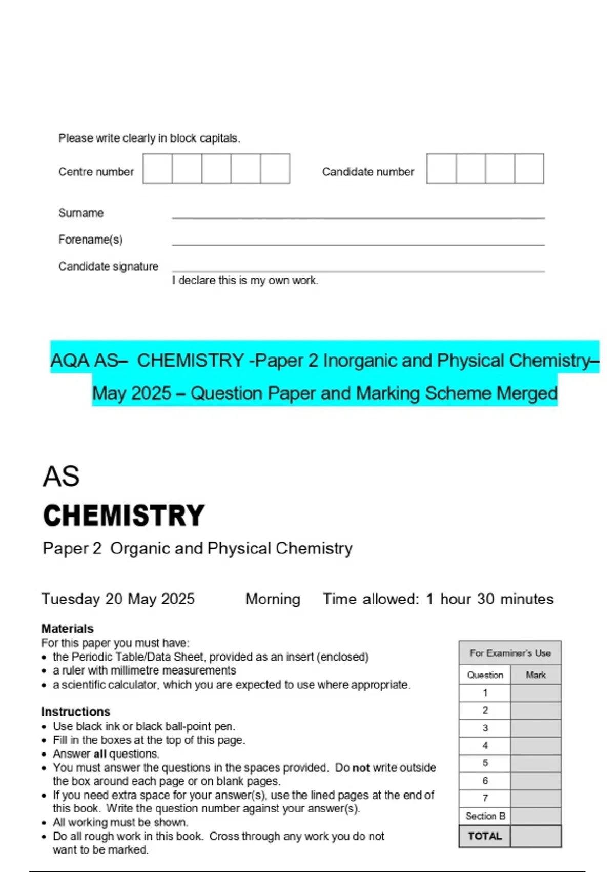 AQA AS- CHEMISTRY -Paper 2 Inorganic and Physical ChemistryMay 2025 - Question Paper and Marking Scheme Merged