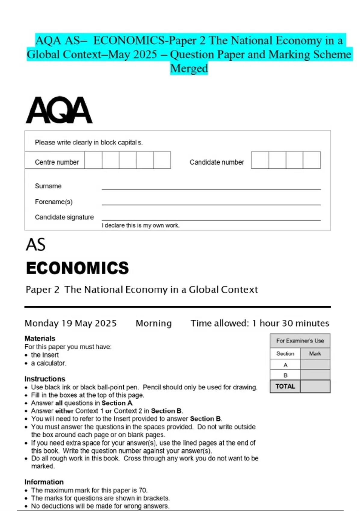 AQA AS- ECONOMICS-Paper 2 The National Economy in a Global Context-May 2025 – Question Paper and Marking Scheme Merged