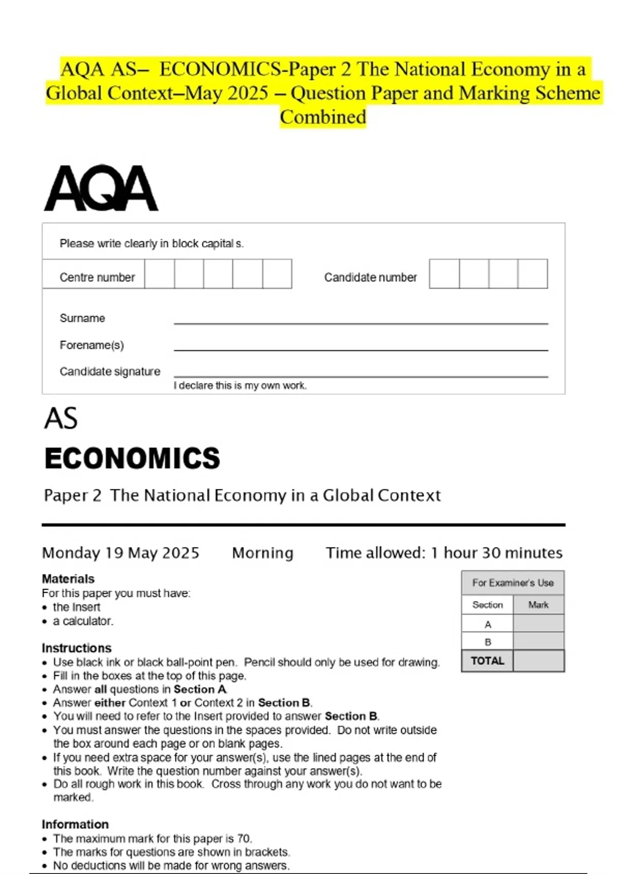 AQA AS- ECONOMICS-Paper 2 The National Economy in a Global Context-May 2025 - Question Paper and Marking Scheme Combined