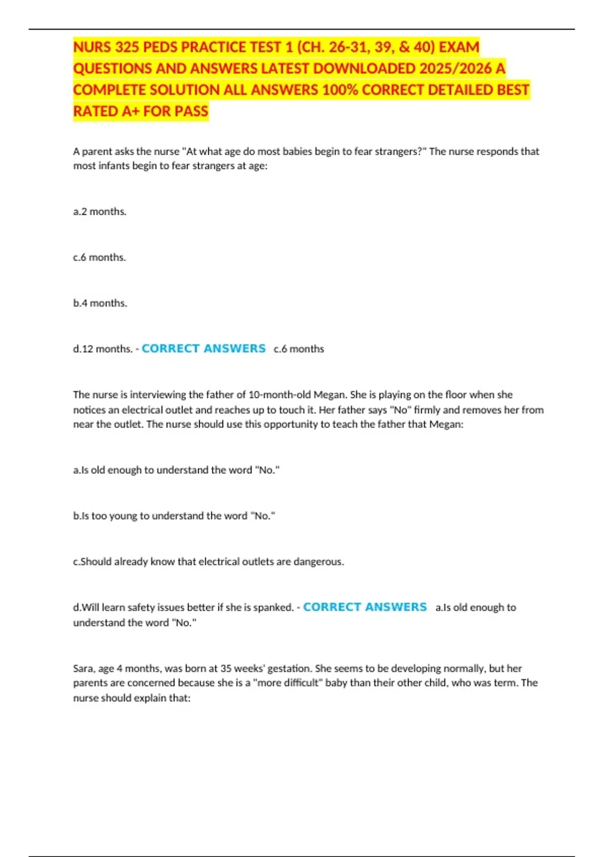 NURS 325 PEDS PRACTICE TEST 1 (CH. 26-31, 39, & 40) EXAM