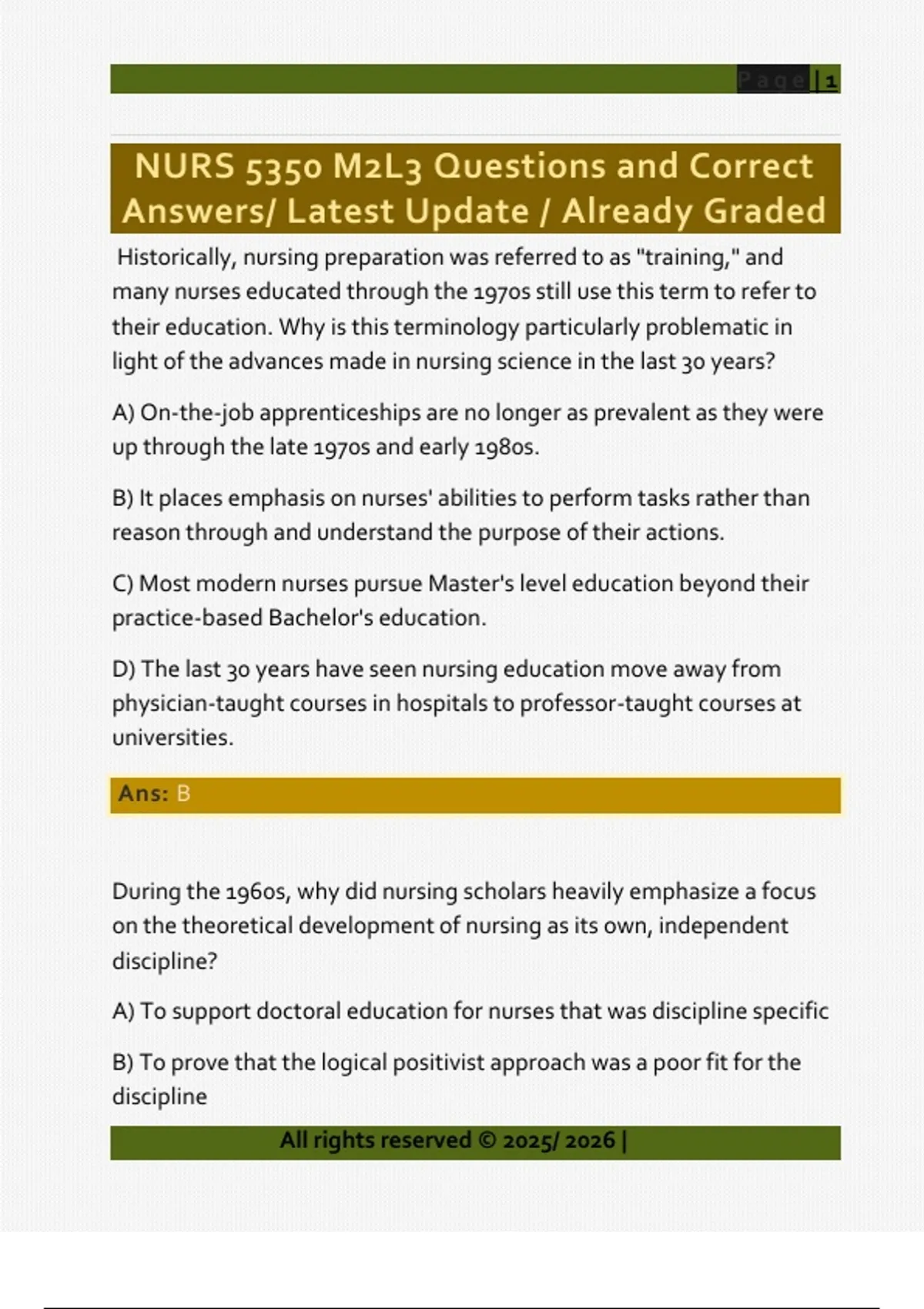 Historically, nursing preparation was referred to as "training," and many nurses educated through the 1970s still use this term to refer to their education. Why is this terminology particularly problematic in light of the advances made in nursing science in the last 30 years? A) On-the-job apprenticeships are no longer as prevalent as they were up through the late 1970s and early 1980s. B) It places emphasis on nurses' abilities to perform tasks rather than reason through and understand the purpose of their actions. C) Most modern nurses pursue Master's level education beyond their practice-based Bachelor's education. D) The last 30 years have seen nursing education move away from physician-taught courses in hospitals to professor-taught courses at universities. Ans: B During the 1960s, why did nursing scholars heavily emphasize a focus on the theoretical development of nursing as its own, independent discipline? A) To support doctoral education for nurses that was discipline specific B) To prove that the logical positivist approach was a poor fit for the discipline All rights reserved © 2025/ 2026 | Page | 2 Ans: C C) To encourage and enhance the continued development of nursing science D) To promote research by nurses in all fields, not merely nursing science Which argument best supports the idea of nursing as a professional discipline rather than an academic discipline? A) "Nursing is an applied science. Its practice component places an emphasis on the delivery of service by nurses rather than the development of academic knowledge." B) "Nursing is a discipline with unique substance. It borrows very little from other disciplines and, as a result, is beyond the realm of most academic programs in the sciences that acknowledge idea sharing across disciplines." C) "Nursing is a concept with a lengthy unofficial history. Individuals have been providing nursing care to others since the Crusades, and this professional provision of services predates formal education in the field." D) "Nursing is a relative newcomer to advanced education. For many years, nurses were educated or trained only at a Bachelor's level, and advanced practice therefore has its roots in the profession itse Ans: A All rights reserved © 2025/ 2026 | Page | 3 Which statement most accurately encapsulates Thomas Kuhn's proposed philosophy of science? A) Science philosophy should address both the conceptual and empirical problems of science and serve as merely a problem-solving activity. B) Science p