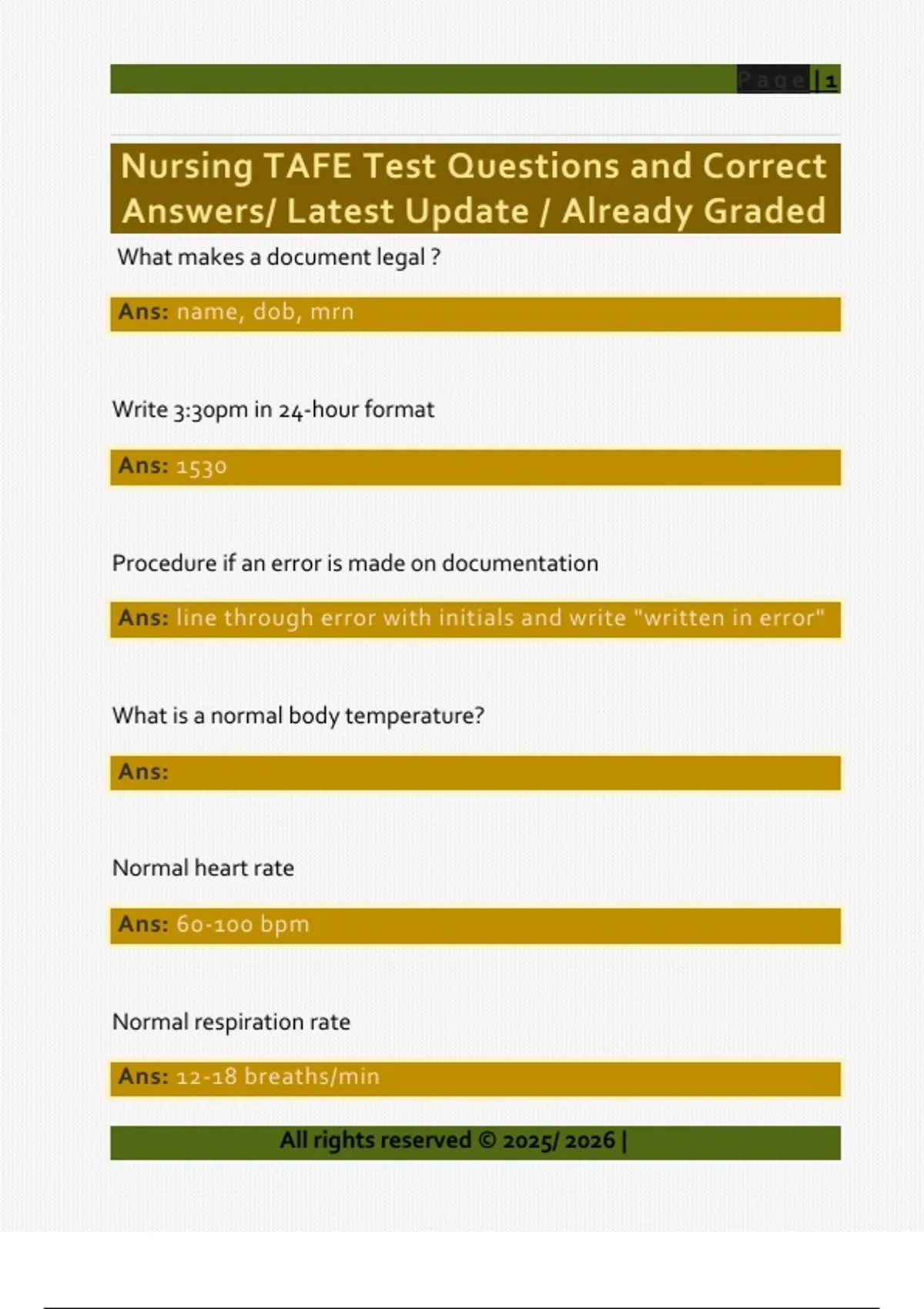 Nursing TAFE Test Questions and Correct Answers/ Latest Update / Already Graded